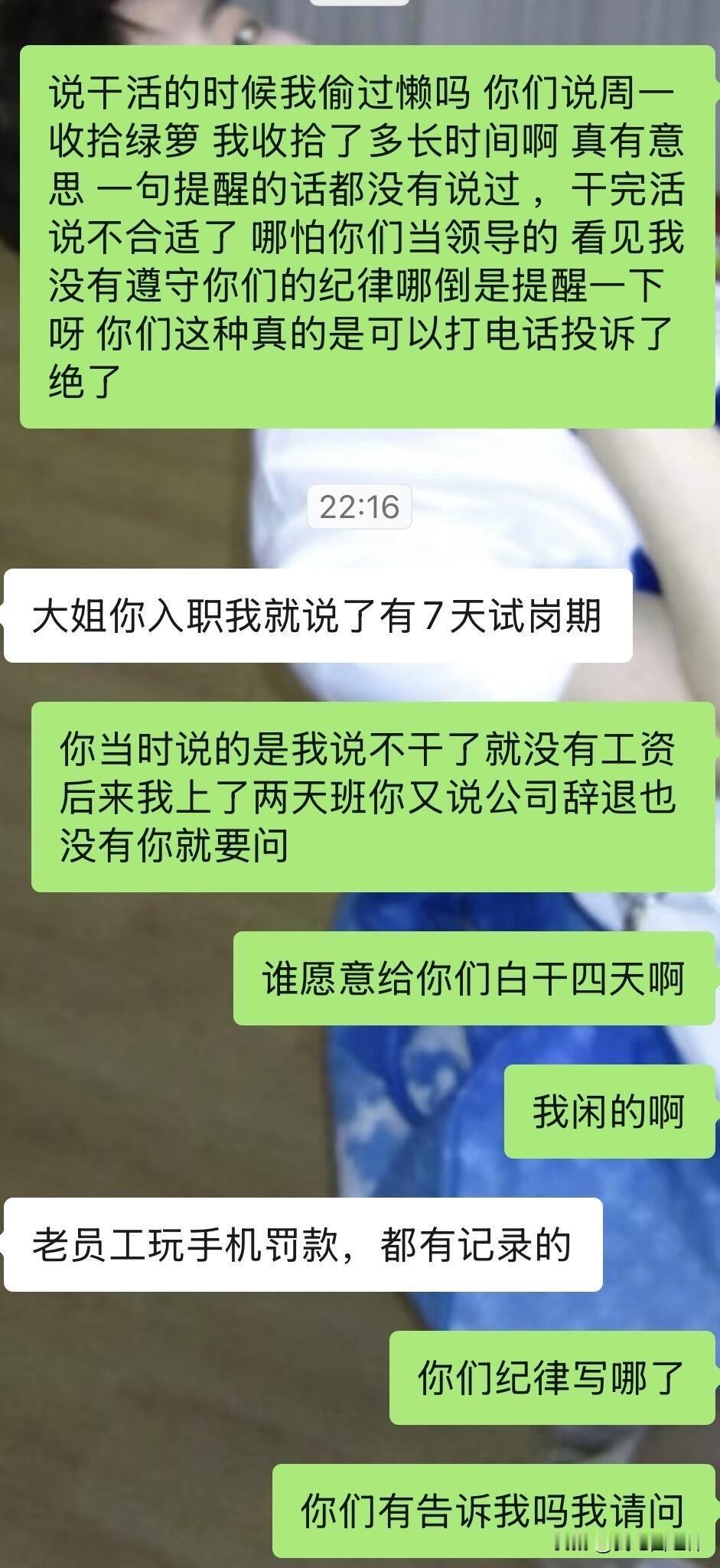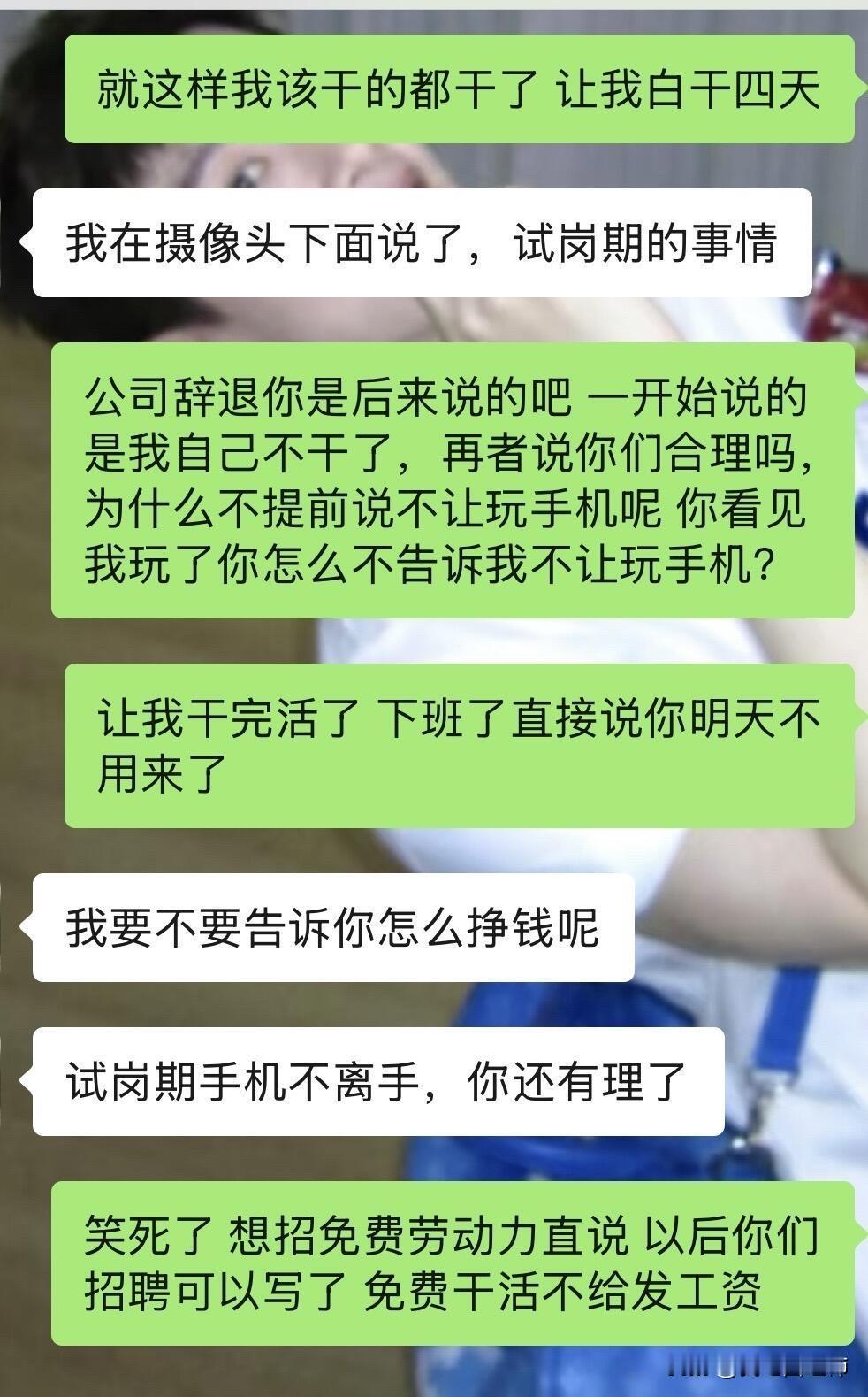 上班四天被辞退了 试用期说七天 一开始告诉我说 我自动辞职是没有钱的 后来又告诉我说被公司辞退也没有工资,然后我干了四天 期间让我干的活我全都干了,今天说擦绿箩叶子 二十多盆我都弄完了,从面试到被辞退 都没告诉我一句规定不让玩手机,白干四天