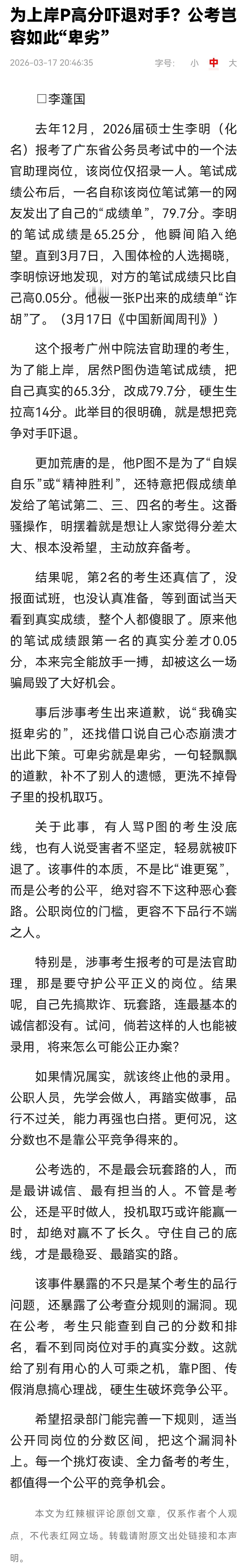 这名P考试成绩的学生会不会被取消录取资格?网友意见不一。 有网友认为其他考生面试发挥不佳主要责任在自己,不能就怪这名考生虚报自己的笔试成绩。因为他并没有通过此举在考场(面试)中获利,不属于作弊行为,而属于向其他考生虚报、炫耀自己考分的行为,这个虚报的成绩也没有派其他实际用场。其他考生声称受到影响,没有认真准备面试,这属于其他考生的自主行为——为何准备面试要受其他人的影响呢? 也有不少网友质疑其人品,是用这种卑劣手段吓退其他考生。但用人单位是否认定其不诚信、人品恶劣而取消资格,还需要拿出确切证据。因为不向其他人透露自己的真实成绩的现象(有的为了面子、虚荣心)在现实中很多,也没有任何规定要求考生要向别人透露自己的真实成绩。 相信用人单位会依法依规做出处理,维护所有考生的合法权利。而此事也提醒用人单位,在公示复试名单时,应公示入围复试者的笔试成绩,让整个招录过程更透明。