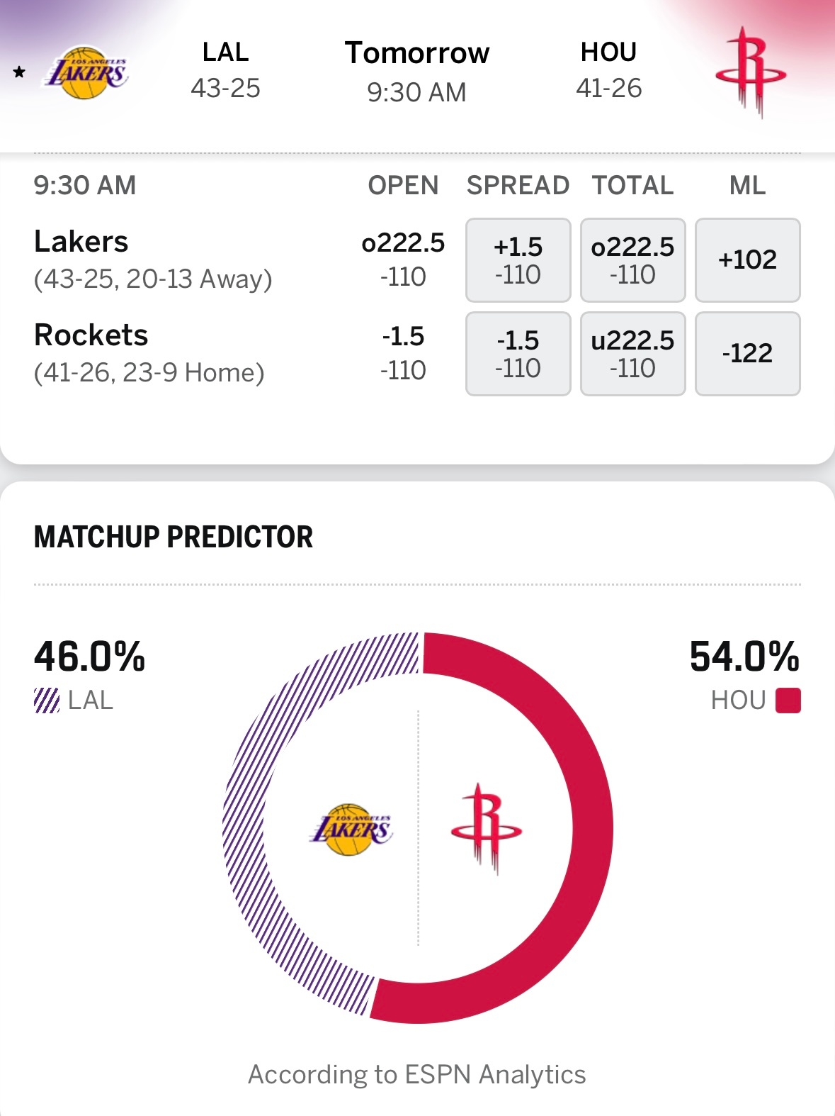依旧平手盘,明日9点30分湖人火箭二番战,ESPN获胜概率:湖人46%、火箭54