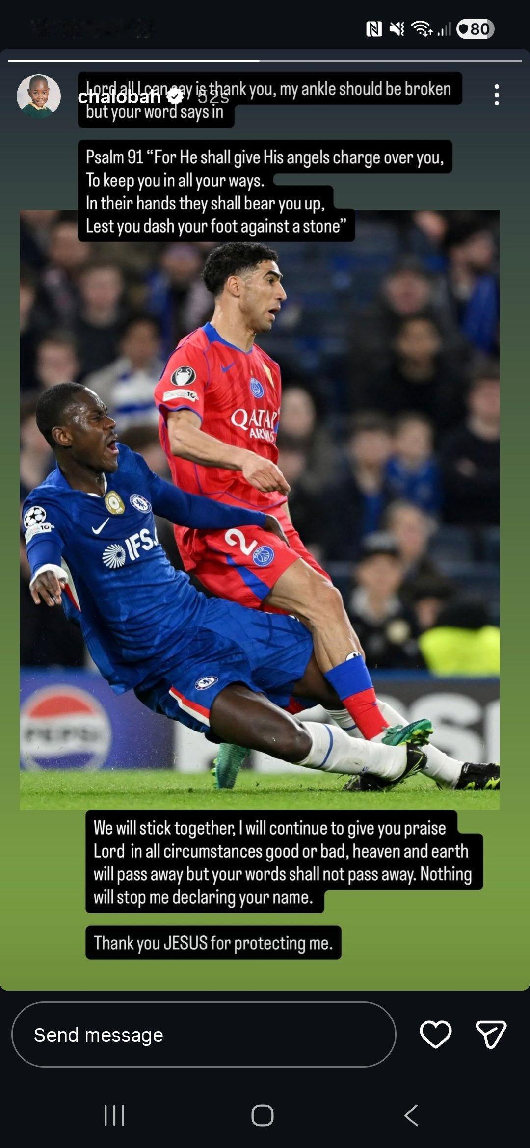 不幸中的万幸,查洛巴无大碍! 欧冠1/8决赛次回合,切尔西主场0-3负于大巴黎。比赛尾声,切尔西后卫查洛巴在拼抢中脚踝严重变形(图2),无法坚持被担架抬出。 赛后好消息传来,查洛巴在社媒发文表示自己没有骨折并感谢了上帝:“主啊,我所能说的只有感谢,我的脚踝本应已经断了,但你的话语在《诗篇》第91篇中说:‘因为他要为你吩咐他的使者,看守你的一切道路;他们要用手托着你,免得你的脚碰在石头上。’ 我们要同心同行,无论环境好坏,我都会继续赞美你。天地会过去,但你的话语永不消逝。没有什么能阻止我宣告你的圣名。 感谢你,耶稣,保佑了我。” PS:队报报道,查洛巴是脚踝扭伤。切尔西