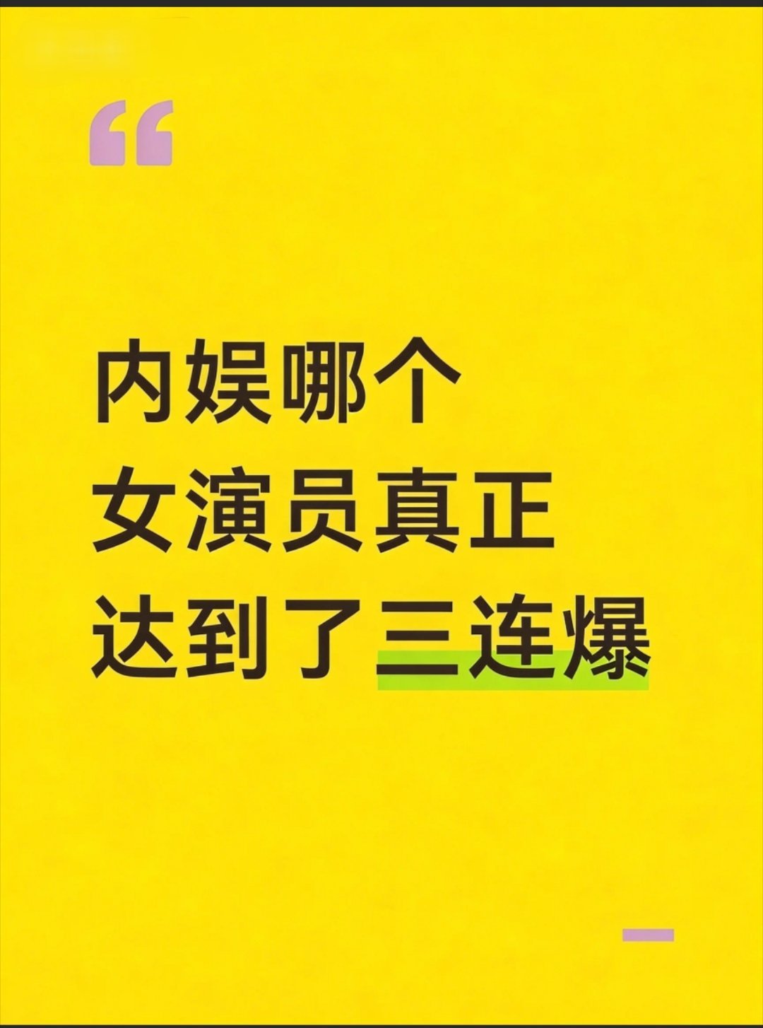 内娱真正达到三连爆的女演员——❶孙俪:《玉观音》《甄嬛传》《那时花开月正圆》。❷梅婷:《不要和陌生人说话》《父母爱情》《七姊妹》。❸杨幂:《宫》《三生三世十里桃花》《生万物》。❹赵丽颖:《花千骨》《知否。知否。应是绿肥红瘦》《与凤行》。❺迪丽热巴:《克拉恋人》《漂亮的李慧珍》《长歌行》❻刘亦菲《金粉世家》《梦华录》《玫瑰的故事》。❼杨紫:《家有儿女》《香蜜沉沉烬如霜》《长相思》。❽赵露思:《传闻中的陈芊芊》《偷偷藏不住》《许我耀眼》。❾马伊琍:《奋斗》《还珠格格》《我的前半生》。其余的你们补充……