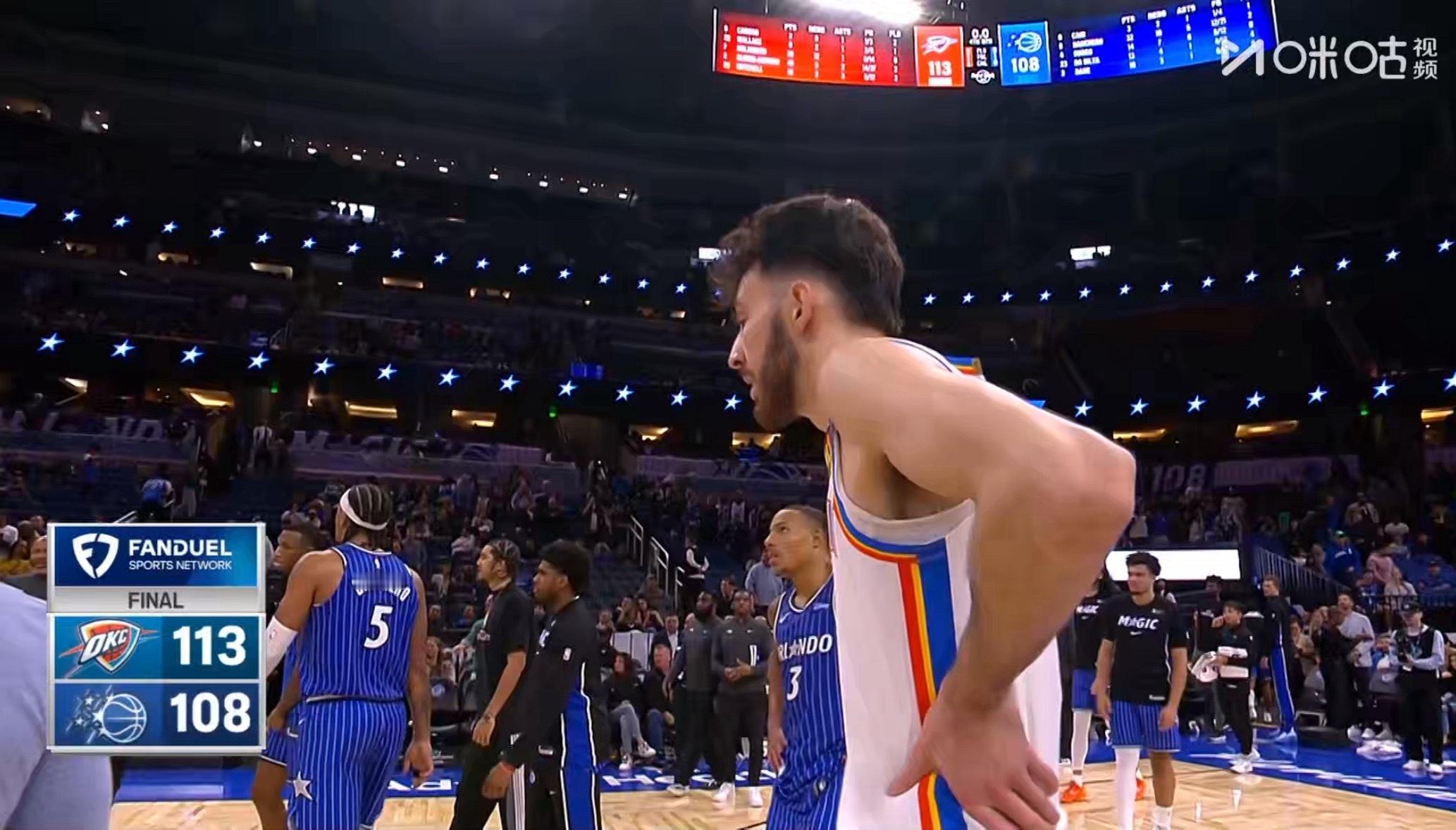 雷霆113-108战胜魔术,雷霆成为第一支锁定季后赛的球队! 亚历山大40分5板2助4断、霍姆格伦20分12板1助、米切尔16分2板3助。班凯罗32分10板5助2断、贝恩16分3板1助、萨格斯14分7板6助。雷霆锁定季后赛 雷霆战胜魔术
