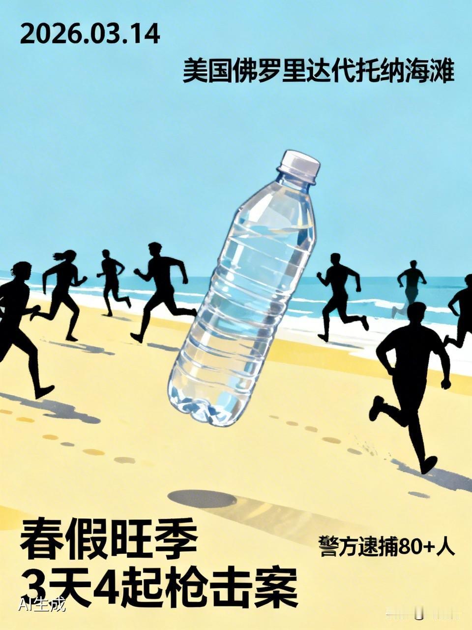 美海滩有人踩水瓶似枪响引众人奔逃 美海滩踩水瓶似枪响引众人奔逃 2026年3月14日,美国佛罗里达代托纳海滩上演了令人哭笑不得的一幕。有人故意踩爆塑料水瓶,其声音酷似枪响,瞬间引发数百游客尖叫奔逃,场面一度失控。实则虚惊一场,既无枪击事件,也无人员重伤。 此事发生在春假旺季,而当地3天内连发4起枪击案,民众对枪声极为敏感。警方于14 - 15日在海滩逮捕80多人,其中6人非法持枪。涉事者若被抓,可能因扰乱公共秩序被起诉,面临罚款和监禁。 美国枪支暴力频发,公共场所的人们对“枪响”形成条件反射式恐慌。这一声“水瓶响”,在人满为患的春假海滩引发大混乱,还增加了踩踏风险。媒体及时报道澄清事实、补充背景,引导公众从恐慌走向理性,也凸显出美国枪支问题给民众带来的心理阴影之深。