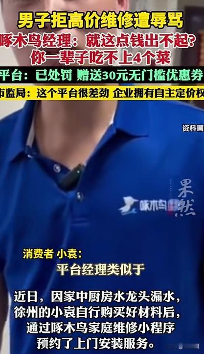 江苏徐州,一男子家厨房水龙头漏水,他买了零件,在啄木鸟小程序预约上门安装服务,师傅上门报价250,给男子优惠到220,男子觉得贵拒绝了,可万万没想到,师傅离开2分钟,又折返回来,要求男子接听他经理电话,经理呵斥男子:你没钱点什么上门维修?这点钱出不起?你一辈子吃不上4个菜! 袁先生住在徐州的一处老小区里,房子已经住了十多年。那天一早,他在厨房洗菜时发现水池下面“滴答滴答”一直响。 弯腰一看,原来是水龙头接口处开始漏水,虽然不算严重,但时间一长肯定要把橱柜底板泡坏。 袁先生平时动手能力一般,想着水管这种东西要是拧不好,可能越修越漏,于是干脆拿出手机,在常用的维修小程序里找到了“啄木鸟上门维修”。 页面上写着“专业师傅、快速上门”,还有不少用户评价,看起来还算靠谱。 他点开服务项目,选择了“水龙头安装/维修”,填好地址,很快就有客服确认订单,说大概半小时内会有师傅上门。 果然,二十多分钟后,一名四十岁左右的维修师傅敲响了门。师傅穿着工作服,拎着工具箱,进门后简单看了看厨房水池下面的情况。 “就是这里漏水。”袁先生指了指接口。 师傅蹲下来摸了摸水管,又拧了两下水龙头,说:“问题不大,就是接口老化了,换个接头就行。” 袁先生点点头,说:“我其实已经买好零件了,你帮我装一下就行。” 师傅听完,起身拍了拍手,报了个价:“安装费250。” 袁先生一听,愣了一下:“250?” 师傅见他表情有点犹豫,立刻补了一句:“给你优惠一点吧,220。” 可袁先生心里还是有点不太舒服。前一天他就查过类似的维修价格,很多本地维修师傅上门安装一个接头,也就一百来块钱,最多一百五左右。更何况零件还是他自己买的。 他想了想,还是很客气地说:“师傅,这个价格有点高,我再考虑考虑吧。” 师傅脸上的笑容顿时淡了些,不过也没多说什么,只是收起工具箱,简单说了句:“那行。”便转身离开了。 袁先生还觉得有点不好意思,毕竟人家白跑一趟,想着下次可能找别的师傅算了。 谁知事情并没有就此结束。 大概过了两分钟,门外突然又响起了敲门声。袁先生打开门一看,还是刚才那位师傅。 “怎么了?”他有些疑惑。 师傅没有进门,只是把手机递过来:“你接一下我经理电话。” 袁先生愣了一下,但还是接过了手机。电话那头是个中年男人的声音,语气一上来就很冲。 “你是刚刚那个不愿意维修的客户是吧?” 袁先生还没反应过来,对方已经开始数落起来。 “你没钱点什么上门维修?这点钱都出不起?你这种人还用什么服务?” 袁先生一下子懵住了,他完全没想到对方会这么说话。 电话那头继续不依不饶:“你知道我们师傅跑一趟多辛苦吗?没钱就别装大款点服务!220块都嫌贵?你一辈子都吃不上四个菜!” 听到这里,袁先生的脸一下子涨红了。 他原本只是觉得价格不合适才拒绝,并没有和师傅争执,更没有说任何过分的话。可现在,对方居然直接进行人身攻击。 袁先生强压着火气说:“我只是觉得价格不合适,不修不行吗?” 电话那头却冷笑了一声:“不修可以,以后别用我们平台。” 说完,电话就被挂断了。 站在门口的维修师傅也显得有些尴尬,接过手机后,简单说了句“那我走了”,就匆匆下楼了。 袁先生关上门,越想越生气。 他觉得自己只是正常消费,既没有辱骂师傅,也没有恶意下单,为什么拒绝服务就要被这样羞辱? 越想越憋屈的他,索性把整件事情的经过写下来,并把通话录音发到了网上。 没想到,这条帖子很快就引起了大量网友的关注。 很多网友纷纷表示愤怒: “报价高可以商量,哪有这样骂顾客的?” “消费者连拒绝的权利都没有了吗?” “上门服务又不是强制消费。” 还有不少人晒出了自己类似的经历,说一些平台维修价格普遍偏高,一旦客户拒绝,有时就会遭遇态度问题。 舆论迅速发酵后,不少媒体也开始关注这件事。网友们纷纷要求平台给出解释:到底是谁给经理这样的底气,可以这样辱骂消费者? 面对不断扩大的讨论,这件事很快就被推上了热搜。