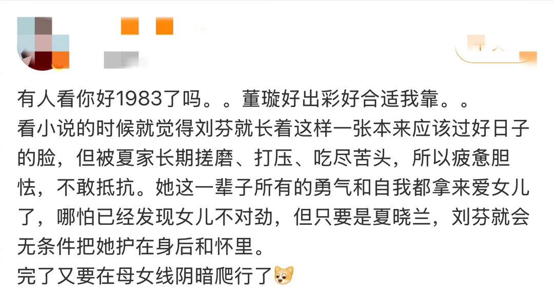 董璇 内娱妈妈赛道上新 刘芬这个妈,胆小了一辈子,却在女儿面前成了超人。鸡蛋羹从家里一路护到地方,女儿一句话她就去捡两筐鸡蛋,看见女儿想不开直接冲上去抱住。董璇把那种又笨拙又用力的母爱演活了。