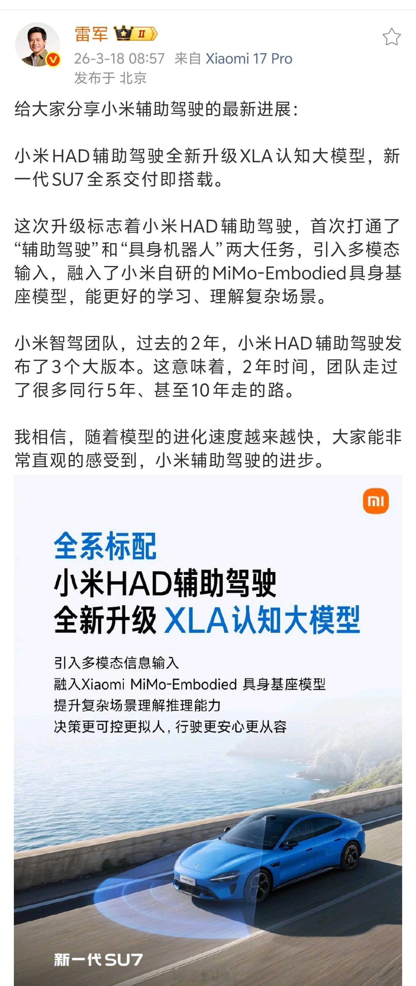 小米新SU7辅助驾驶升级XLA大模型 我特别支持雷总隔三差五提醒大众“辅助驾驶 ≠ 自动驾驶。”毕竟前两年智驾营销还没管控,需要潘达这样的正能量博主进行正确引导。