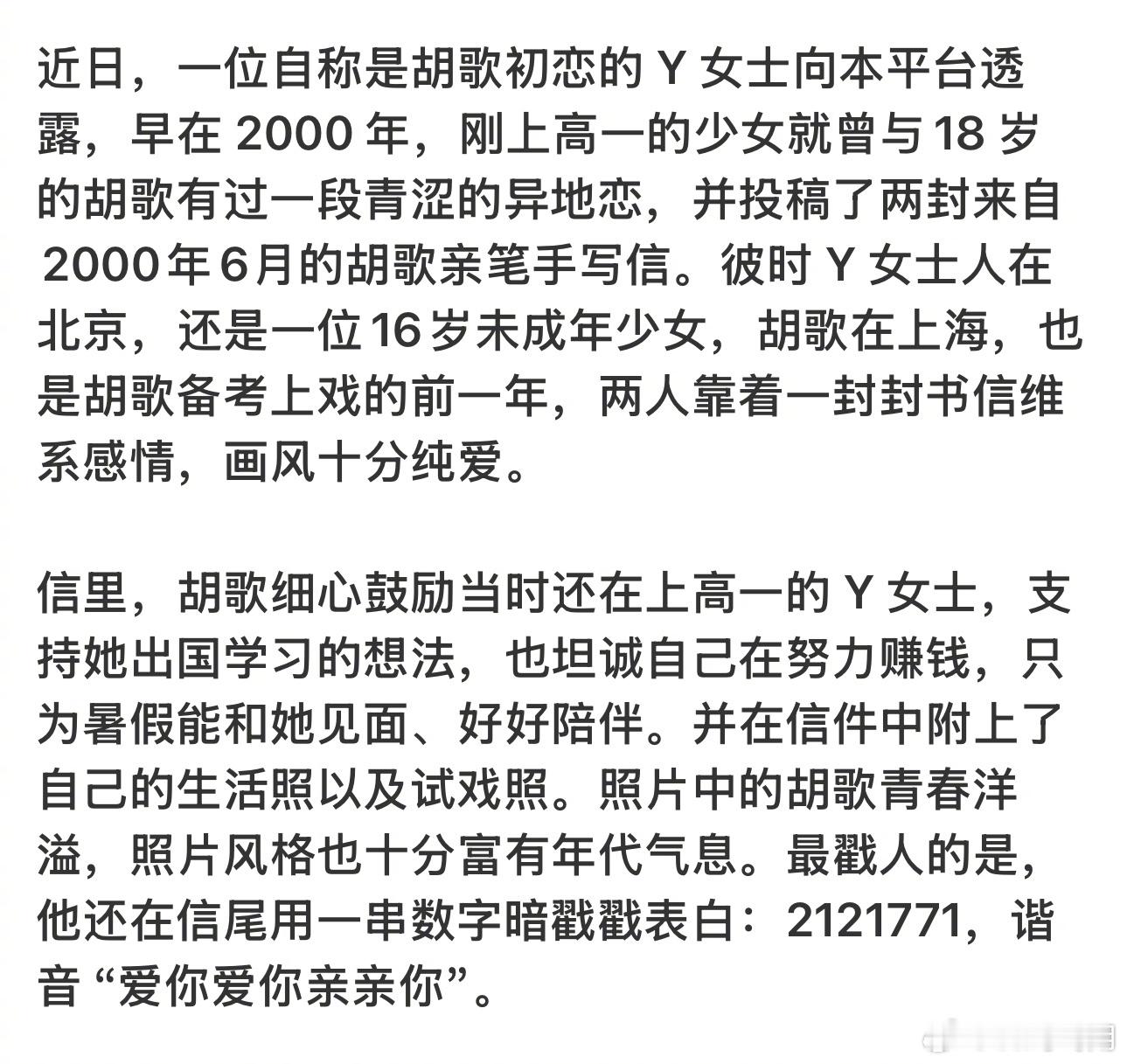 狗仔公布了胡歌的初恋信笺。在高中时,胡歌和这位女生恋爱,胡歌说会努力赚钱,暑假找她玩,还要给她买礼物。2121771=爱你爱你亲亲你