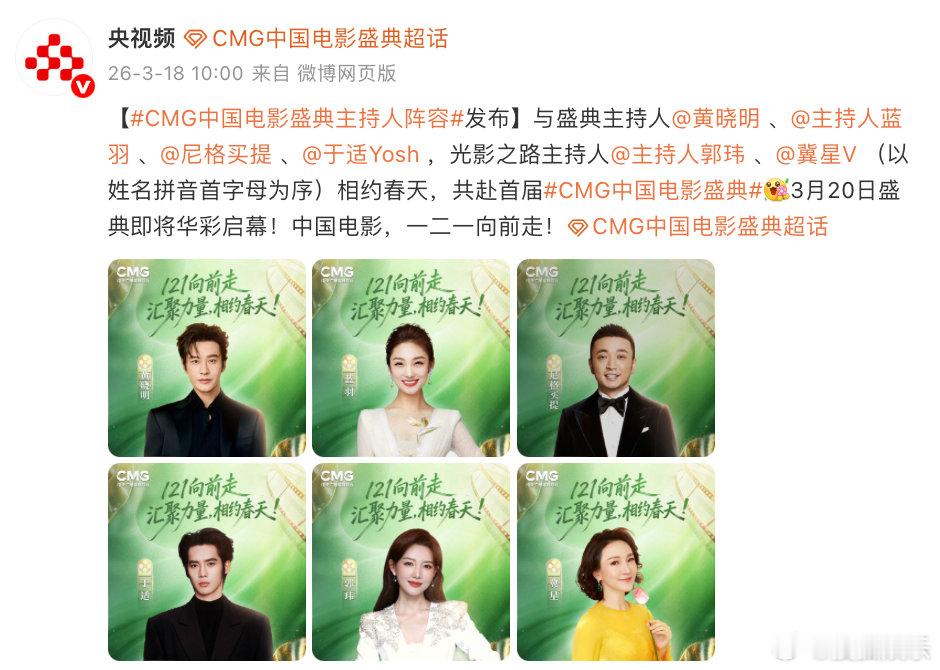 于适首届CMG中国电影盛典主持人今日,正式官宣担任首届CMG中国电影盛典主持人!
