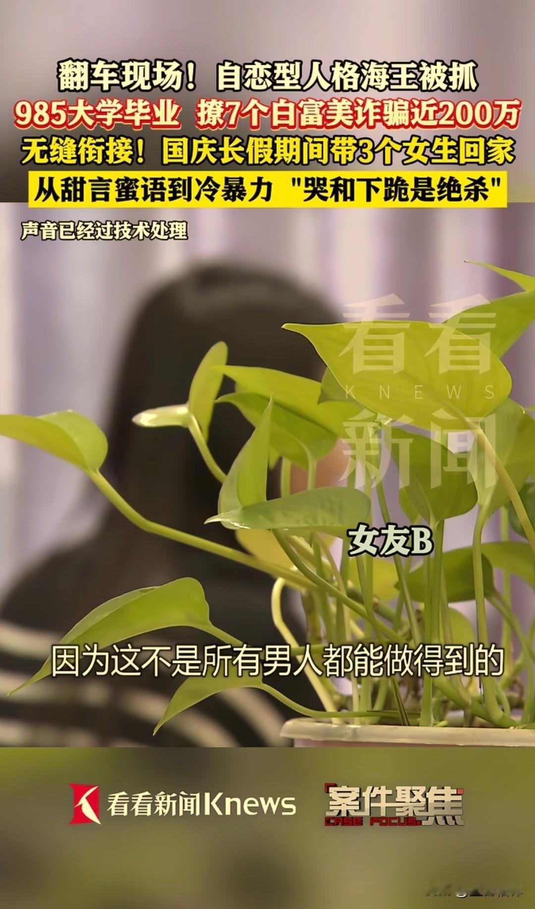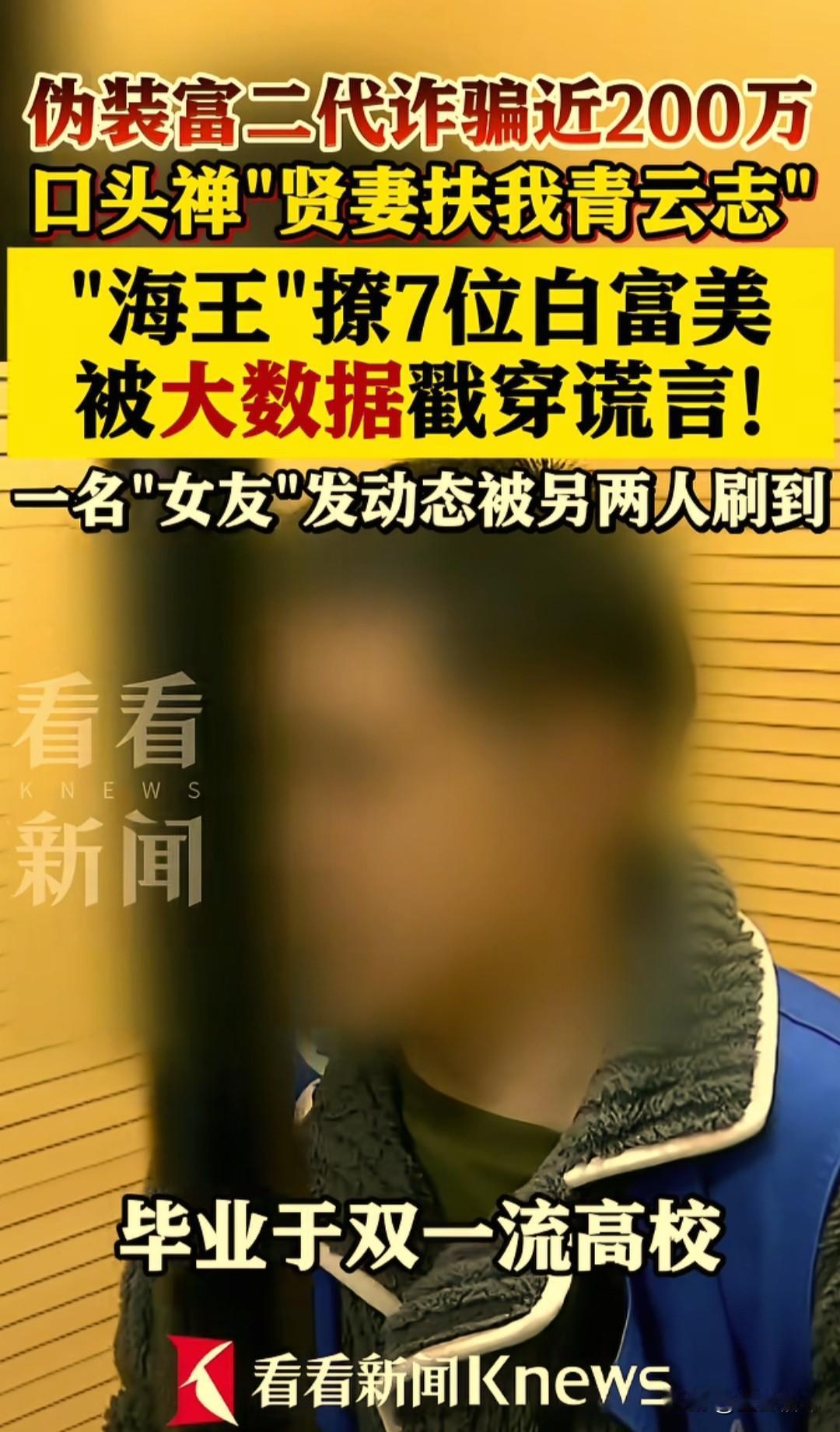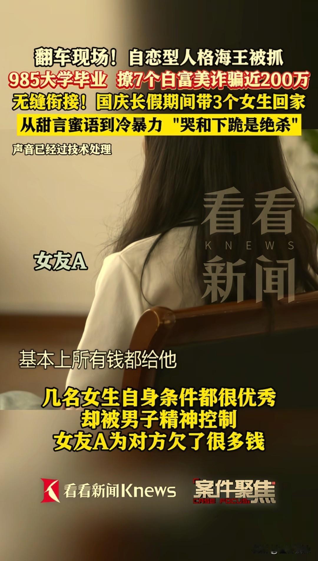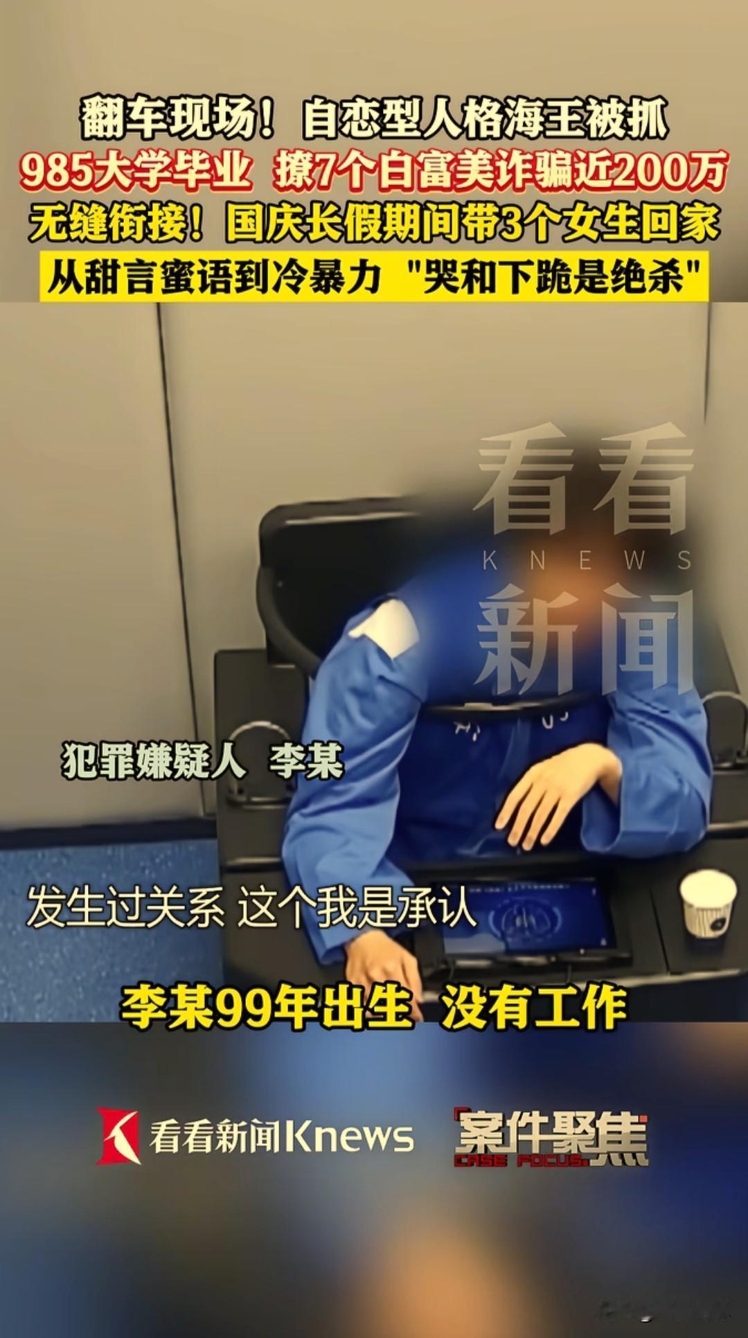 上海99年双一流“海王”翻车!同时交往7名白富美,诈骗近200万,被大数据戳穿骗局 一名小姐姐在网上发帖说被男友骗了钱,结果这个社交动态被另外两位女生刷到,三人互相联系上后核对时间线,发现男朋友竟然是同一个人,于是联手报警将其抓获。 这起震惊全网的情感诈骗案,嫌疑人李泽,1999年生,双一流高校毕业,凭借精心包装的富二代人设,将多名女性玩弄于股掌之间,最终因涉嫌诈骗罪被检察机关批准逮捕。 这名叫李泽的男子没有工作、还背负着网贷,却靠租赁豪车、打造高端朋友圈,伪装成家境优渥的创业青年,口头禅“贤妻扶我青云志”,疯狂PUA受害女性。 他同时交往7名女子,年龄19-30岁,多为家境优渥、单纯善良的白富美,国庆期间甚至同时带3名女友回家,堪称“海王天花板”。 恋爱初期,他提供满分情绪价值,甜言蜜语哄得对方掏心掏肺;一旦拿到钱财,立刻变脸实施冷暴力,不给钱就哭闹、下跪道德绑架,堪称他的“绝杀技”。 他以生意周转、投资创业为借口大肆借钱,一名两年内女子被骗了122万,这名女子性格乖巧生活中也没什么朋友。他给了女子很足的情绪价值,女子喜欢赛车,他就是赛车达人,喜欢电影,他就是专业讲解员,女子很是感动,对他非常依赖,对男子全心全意,只要他在,手机都不看。 另外一名女子三年被骗40多万,这名女子性格成熟不粘人,她觉得男子不抽烟不喝酒,应该是一个很干净的男生,她也喜欢对方。 男子除了提供的情绪价值很到位,还租了几台豪车,来回换着开,专门接送这些女生,打造富二代人设。 一名女子从刚开始一个人住月租一万五的公寓,后搬到2500元的合租房,还变卖了自己的一些奢侈品,到处借钱,就是为了帮助他的男友,她要分手,男子哭着下跪求原谅。 累计涉案近200万,赃款全被用于个人挥霍与还债,却毫无还款能力。被抓后嫌疑人只承认和其中两名女子是恋爱关系,说:“我和她们发生过关系我承认,但我又不是跟她们谈恋爱,不算女朋友,我也愿意给她们打欠条,以后去还款。” 高学历≠高人品,富二代光环全是骗局!恋爱中但凡以爱为名索要大额钱财、情绪操控、行踪诡异,一定要立刻警惕。别让真心,成为骗子敛财的工具! 来源:看看新闻