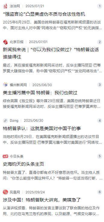 特朗普太直了,直得你都有点不好意思说他坏,当主持人质问:“你怎么能信中国这种坏人?”特朗普一句话当场打断,把主持人噎得半天没接上话,脸都僵住了。 麻烦看官老爷们右上角点击一下“关注”,既方便您进行讨论和分享,又能给您带来不一样的参与感,感谢您的支持! 去年美国福克斯新闻演播厅里上演了一出好戏,把美国那点小心思全抖搂出来了。当时特朗普正接受《周日早间期货》节目采访,对面坐着的主持人叫玛丽亚·巴蒂罗莫,是个老跟在反华议题后面跑的人。她那天准备得挺充分,上来就按着套路来,拿所谓“中国黑客攻击美国电信系统”“窃取知识产权”这些事儿当开场白,想给特朗普递话,让他顺着杆子往上爬,痛痛快快骂中国一顿。这招在西方媒体圈里算是标准操作,先把脏水泼出去,再把“道德高地”的帽子给自己戴上,一套组合拳打得行云流水。 可谁也没想到,特朗普压根儿没按剧本走。他听主持人叨叨完,没跟着起哄,反而一脸淡定地反问了一句:“你觉得我们就没对他们做过这些事儿吗?”这话一出,现场气氛立马就变了。主持人还没反应过来,特朗普又补了一刀:“我们会的,我们做过很多事儿。这世界就是这么转的,本来就是个肮脏的世界。”当时主持人那张脸,据说僵得跟打了肉毒杆菌似的,半天没接上话。这种场面在西方直播访谈里可太少见了,平时都是主持人拿着话筒追着嘉宾问,这次倒好,自家总统直接把自家媒体搭的戏台给拆了。 其实仔细琢磨琢磨,特朗普这话说得虽然糙,但理不糙。美国这些年嘴上喊着“网络清洁”,手上可一点没闲着。“棱镜门”那事儿大伙儿都还记得,美国国家安全局连德国总理默克尔的手机都监听,欧洲空客、巴西石油这些公司的商业机密也被偷了个遍,就为了给自家企业争口饭吃。更绝的是,美国中情局从二战结束就开始操控瑞士一家加密公司,通过卖设备偷了全球120多个国家的机密,这事儿直到2020年才被扒出来。就这履历,还好意思指着别人鼻子骂“小偷”?特朗普那句话,等于把这层窗户纸给捅破了:你们整天骂人家干的那些事儿,咱们自己哪件没干过?而且干得还更早、更狠。 这事儿说到底,暴露了美国政坛一个老毛病,就是搞“双重标准”搞得太顺手了。美国这些年一直推一套歪理,把网络间谍分成两类,一类叫“政治间谍”,说是为了国家安全,可以睁一只眼闭一只眼;另一类叫“经济间谍”,专门偷商业机密的,这就得往死里打。这套说辞听起来冠冕堂皇,其实经不起推敲。2013年中美谈网络安全的时候,美国官员还一本正经地说“我们从来不干经济间谍这事儿”,结果没过多久,“斯诺登事件”爆出来的文件就把他们的脸打肿了。特朗普这次等于在电视上亲口承认:那些所谓“经济间谍”的帽子,咱们自己戴也正合适。 特朗普为啥要这么说?有人说他嘴快,想到啥说啥,这倒不假,但光用“嘴快”解释不了全部。你得看他当时的处境。2025年年中那会儿,美国经济正卡在坎儿上。国会预算办公室的数据摆在那儿,GDP增速往下掉,失业率往上蹿,通胀压不下来,老百姓买东西贵得直骂娘。之前加征关税那招,不但没伤着对手,反噬效应倒挺明显,美国消费者每年得多掏1300亿美元,摩根大通甚至警告说下半年搞不好要衰退。更要命的是,美国好多产业对中国供应链的依赖根本绕不开,稀土精炼九成以上得靠中国,特斯拉造车、F-35战斗机生产都指着这些原材料。这时候再把中国往死里得罪,那不是跟自己过不去吗? 所以特朗普那段时间的对华态度,其实挺微妙的。就在这次访谈前几天,中美刚在伦敦谈妥了一揽子协议,美国暂停了部分关税,还暂缓了针对中国芯片企业的限制措施。特朗普自己也在节目里说“我们跟中国相处得挺好”。他心里清楚,那些天天喊“对华强硬”的口号,喊完老百姓是爱听,但解决不了实际问题。农场主的大豆得卖出去,工厂的零部件得买进来,这些才是硬道理。主持人逼着他骂中国,等于逼着他跟自己刚谈成的协议唱反调,他能干吗? 当然,特朗普这话一出口,美国国内就炸了锅。支持他的人觉得这老头儿真实,不装,有啥说啥,这才是大家想看到的“真诚总统”。反对他的人则气得跳脚,骂他“泄露国家机密”“损害美国形象”,说他太不靠谱了,这种话怎么能当着镜头说。两边吵得不可开交,倒把一个问题摆到了台面上:美国这些年到处推销的“道德优越感”,到底有多少是真的? 国际社会那边也没闲着。美国的盟友听了这话,心里肯定不是滋味。毕竟被美国监听这事儿,大家心知肚明,只是以前美国嘴上还挂着“共同价值观”,面子上过得去。现在自家总统亲口说“世界本来就是肮脏的”,等于把那层温情脉脉的面纱也扯了。往后谁还敢真心实意跟你谈“信任”?至于中国这边,反应倒挺淡定,外交部重申了反对双重标准、主张相互尊重的一贯立场,没跟着起哄,也没借题发挥。