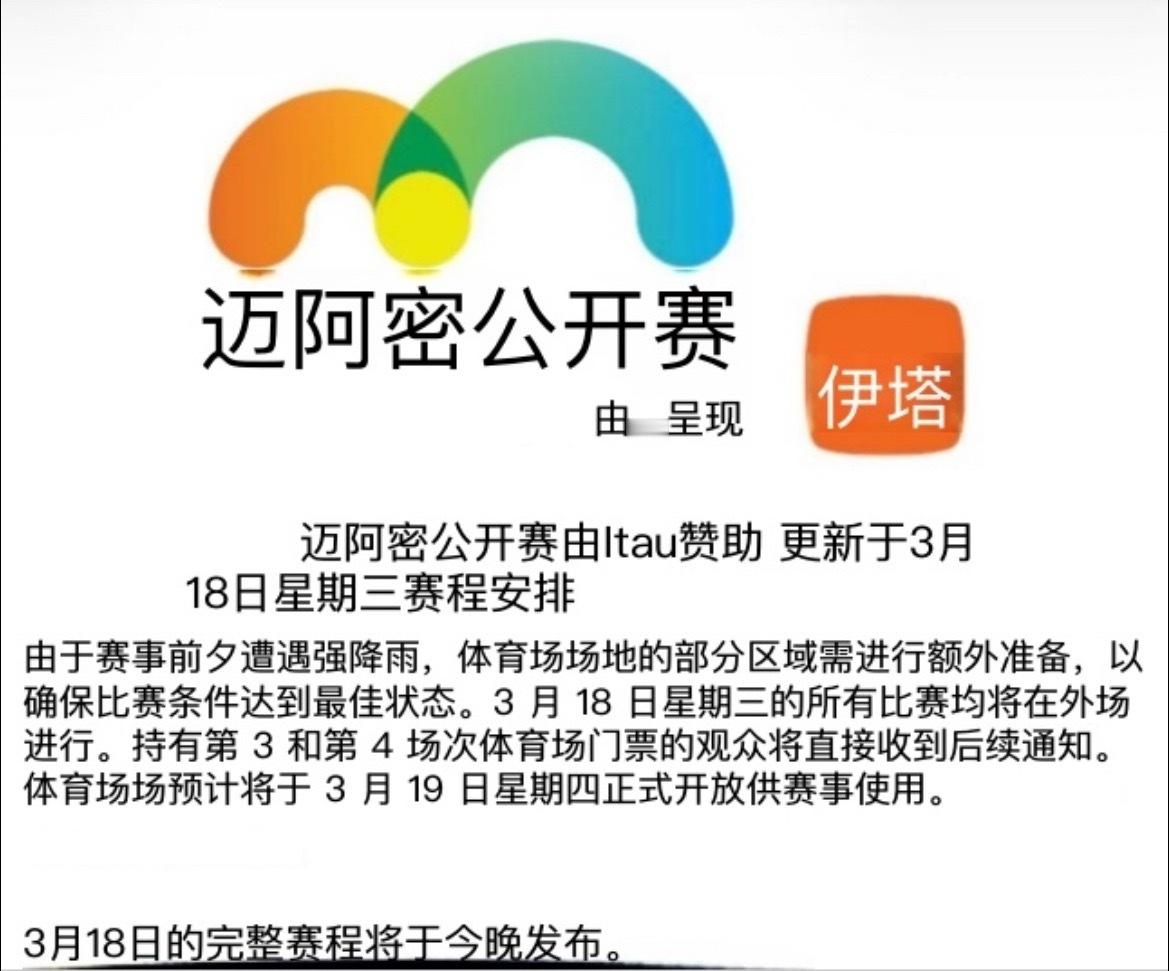 网球talking大会 官方消息:由于“需要进行额外准备以确保比赛的最佳条件”,迈阿密公开赛3月18日将不使用主体育场。