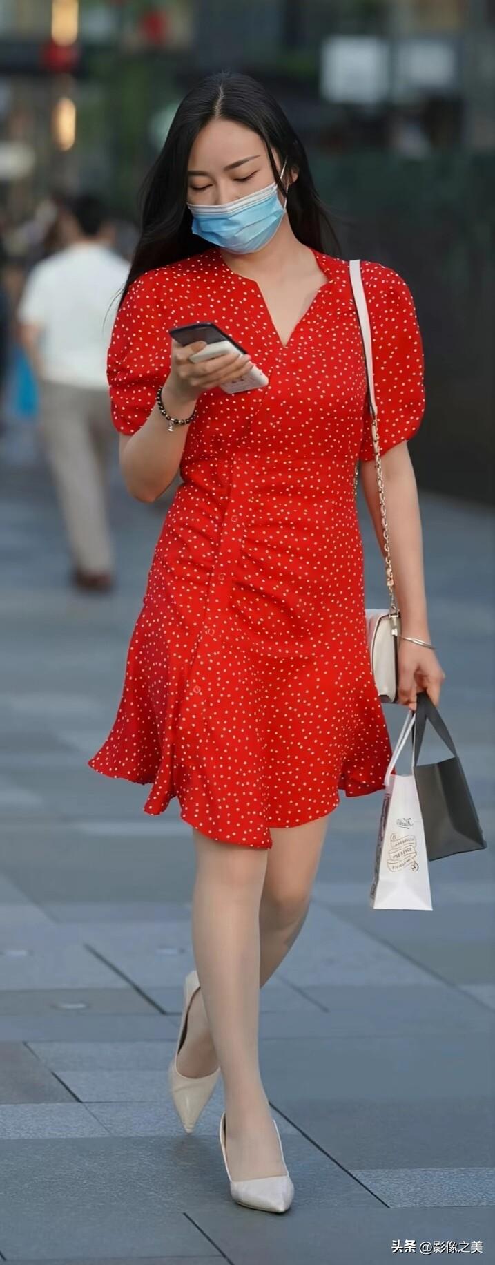 红色波点连衣裙复古又元气,泡泡袖设计温柔减龄,搭配白色尖头高跟鞋,漫步街头氛围感