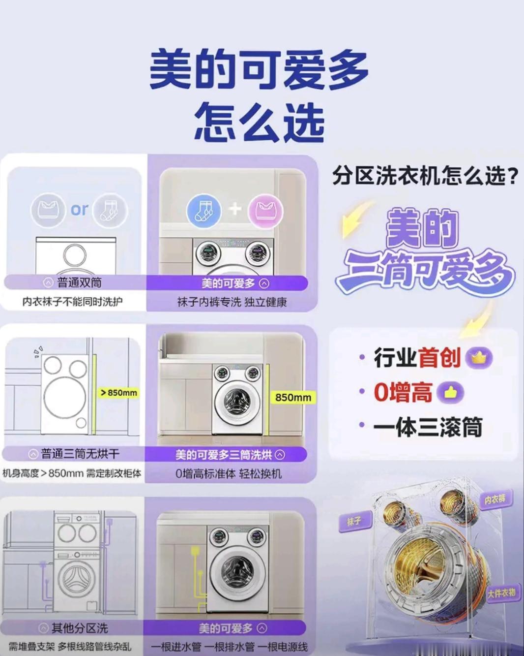 杭州天气有时候让人琢磨不透,一下雨就是好几天,湿嗒嗒雾腾腾的天气衣服洗了很难晾干,总觉得家里有了洗衣机还缺少烘干机。现在美的推出的“可爱多洗衣机”的洗衣、烘衣、健康护理等功能不仅可以把女同胞从繁重的家事务中解脱出来,还可以让日常生活更省心、更具有时代气息。 美的推出的“可爱多洗衣机”完全实现了家庭生活上升到科技赋能的高品质生活,用热泵柔烘的新模式,提升了现代居家生活的水平。 美的推出的“可爱多洗衣机”拥有三筒分区洗烘、内衣、袜子和外套床单等分门别类功能,可以一次性搞定这些衣物洗涤,而且还能够达到医护级杀菌除螨效果,充分体现了新时代崇尚的更健康、更科学与更有温度的生活品质,让我们的家庭生活更加可爱多一点,干爽多一点。 (图片全部来自网络侵删)