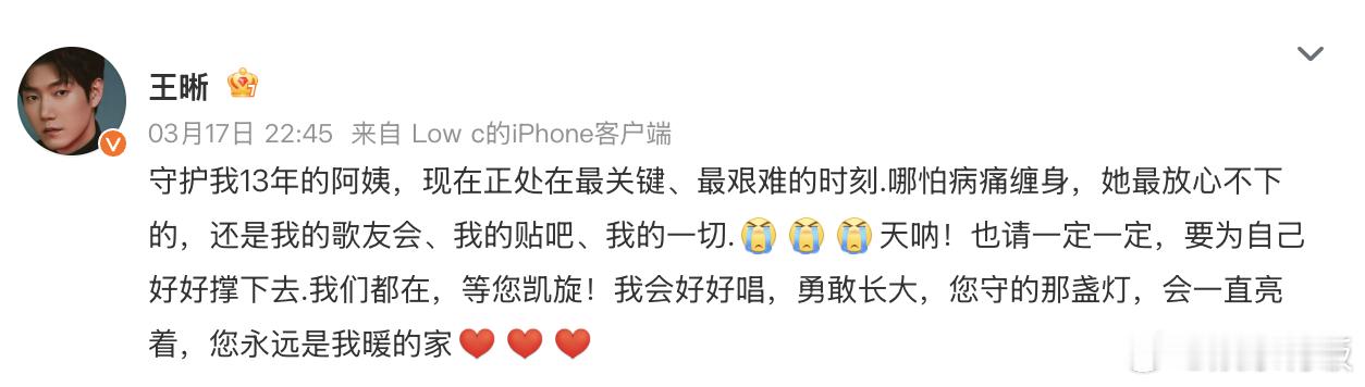 王晰为生病的阿姨粉祈福王晰发博为13年老粉祈福 王晰发博为生病的粉丝祈福,相互守护13年,是彼此生命里的光,希望阿姨尽快康复