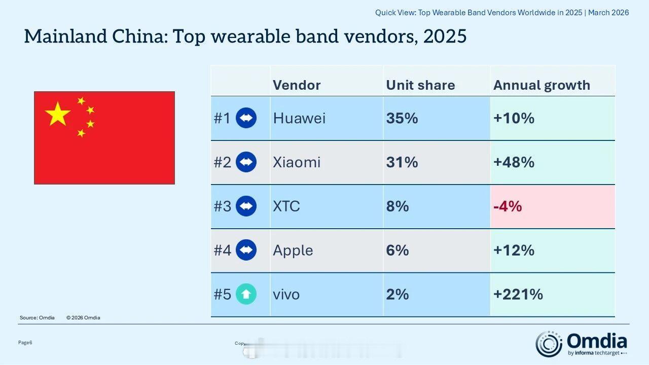 2025年可穿戴腕带设备排名全球市场小米第一,苹果第二,华为第三,中国市场华为第一,小米第二,小天才