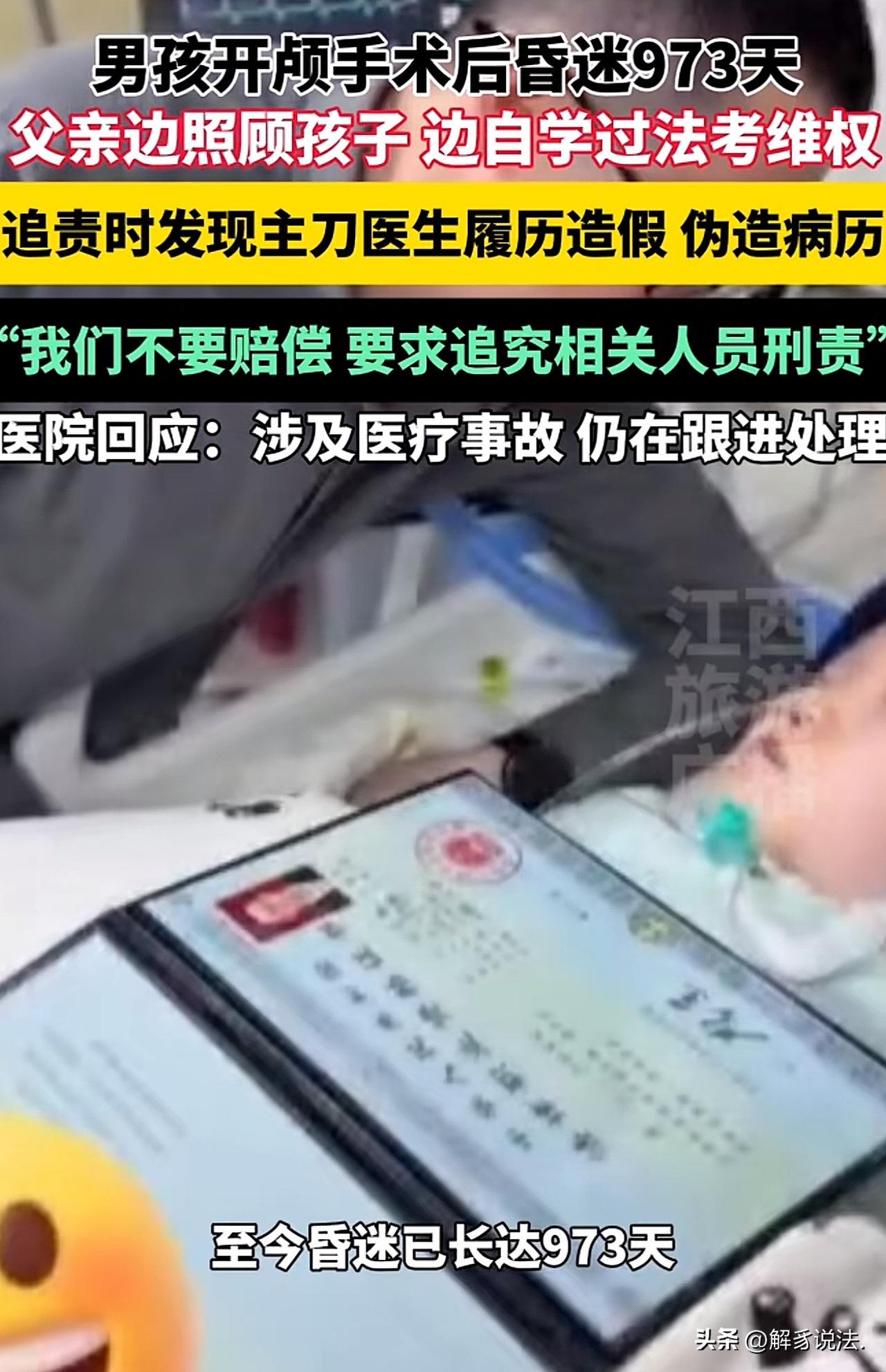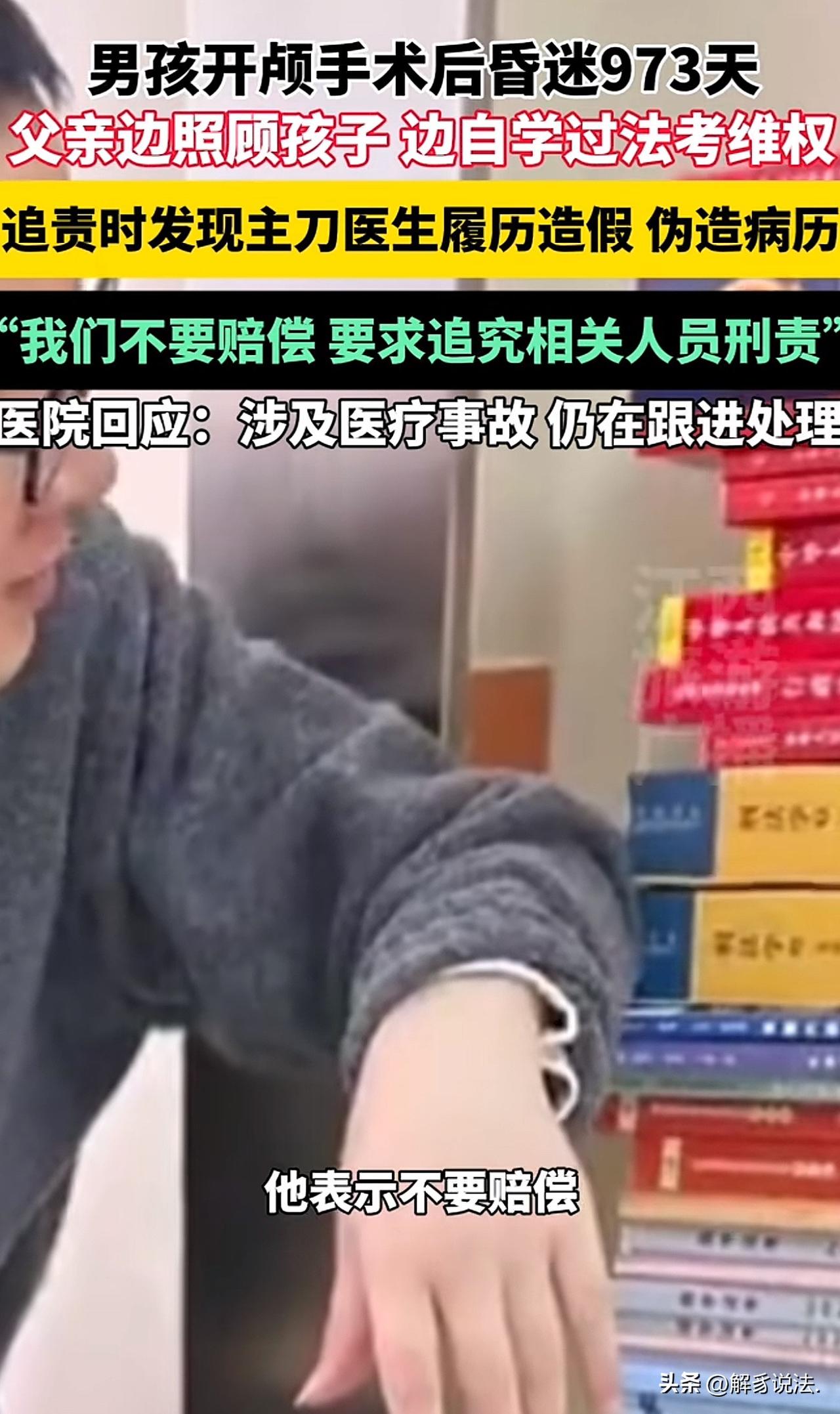 江苏无锡,16岁男孩做开颅手术后,昏迷973天。男孩父亲在追责过程中发现主刀医生不仅履历造假,还篡改病历,他暴怒,下定决心为儿子讨回公道,他一边照顾孩子,一边自学通过法考。他说:我不要赔偿,再多赔偿也换不回来自己活蹦乱跳的儿子,我只要主刀医生受到应有的惩罚! 龚先生怎么也压不住心头的怒火,当他查清真相的那一刻,这个朴实的男人气得浑身发抖。 他无比信任的主刀医生,竟然履历造假,还私自篡改了儿子的病历! 看着病床上一动不动、昏迷了整整973天的儿子,龚先生心如刀绞,眼泪止不住地往下流。 曾经活泼开朗、年仅16岁的少年,如今毫无生气地躺着,曾经的欢声笑语全都没了,只剩下无尽的煎熬和心疼。 那一刻,龚先生暗暗发誓,不管有多难,他一定要为儿子讨回公道,他不要任何赔偿,只希望造假犯错的医生能被追究刑事责任,给躺在病床上的孩子一个交代。 这场让家庭坠入深渊的悲剧,源于一场意外。16岁的儿子不幸受伤,情况危急,必须立刻进行开颅手术。 龚先生守在手术室外,每一分每一秒都备受煎熬,他满心祈祷手术顺利,盼着儿子能平安出来、早日康复。 可现实给了他沉重一击,手术结束后,儿子非但没有好转,反而陷入了深度昏迷,这一睡,就是973天。 看着昔日活蹦乱跳的儿子变成如今模样,龚先生日夜守在床边,悉心照料,从未离开。 可他心里始终有个疙瘩,总觉得事情不对劲,于是开始一点点追查儿子昏迷的真正原因。 随着调查一步步深入,一个让他崩溃的事实浮出水面:给儿子主刀的医生,履历全是伪造的,根本不具备相应的资质,而且还擅自篡改了儿子的病历资料。 这样的行为,很可能直接导致了手术出现问题,让儿子陷入长久的昏迷。 得知真相的龚先生悲愤交加,他无法接受,自己把儿子的性命托付给医院,换来的却是不负责任的欺骗和伤害。 可龚先生只是一个普通百姓,23年没碰过书本,对法律一窍不通,想要为儿子维权,难如登天。 但为了孩子,再难他也咬牙坚持。白天,他寸步不离地照顾昏迷的儿子,喂饭、擦身、观察病情,一刻也不敢松懈;到了深夜,等儿子睡熟,他才拖着疲惫不堪的身体,翻开厚厚的法律书开始苦学。 晦涩难懂的法律条文,让他无数次看得头晕脑胀,可一想到病床上的儿子,他就重新打起精神,反复研读、认真做笔记,不懂的地方就四处查资料、请教别人。 日复一日的坚持没有白费,2025年,龚先生成功通过了法律职业资格考试。 拿到成绩的那一刻,这个坚强的父亲泪流满面,这不仅是对他付出的认可,更是为儿子讨回公道的希望。 如今,龚先生已经做好了所有准备,他要用自己学到的法律知识,和造假的医生对簿公堂。 他始终坚信,法律是公平正义的,一定会还给儿子一个说法。 而他也会一直守在儿子身边,日复一日地等待,盼着孩子能有醒来的那一天,亲口告诉儿子:爸爸拼尽全力,为你讨回了公道。 这份如山的父爱,让人泪目;而医生履历造假、篡改病历的恶劣行为,也理应受到法律的严惩,还患者和家属一个公道。 《民法典》第1222条规定:患者在诊疗活动中受到损害,医疗机构存在遗失、伪造、篡改或者违法销毁病历资料情形的,直接推定医疗机构有过错。 本案中,主刀医生履历造假、私自篡改病历,属于严重违法违规行为。 按照这条法律规定,只要医院存在篡改、伪造病历的行为,法律就直接认定医院有错,不需要家属再费力去证明医院有过错。医院必须承担相应的侵权赔偿责任。 同时,医生无资质上岗、伪造履历,属于严重不负责任。如果查实该行为与孩子长期昏迷存在因果关系,还可能触犯《刑法》中的医疗事故罪,依法可追究刑事责任。 龚先生不要赔偿、坚持追责的诉求,完全符合法律规定。 这条法律就是为了保护患者权益,严惩医院伪造病历、隐瞒真相的行为,正义一定会站在龚先生这边。
