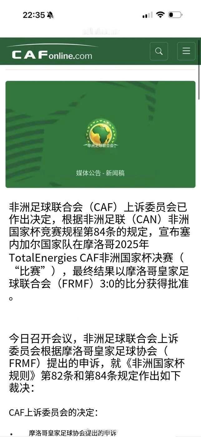 非洲足联认定塞内加尔罢赛行为违反赛事规则第82条(拒绝比赛)和第84条(判0-3负),摩洛哥足协据此上诉成功。非洲杯冠军被改判给摩洛哥中超联赛