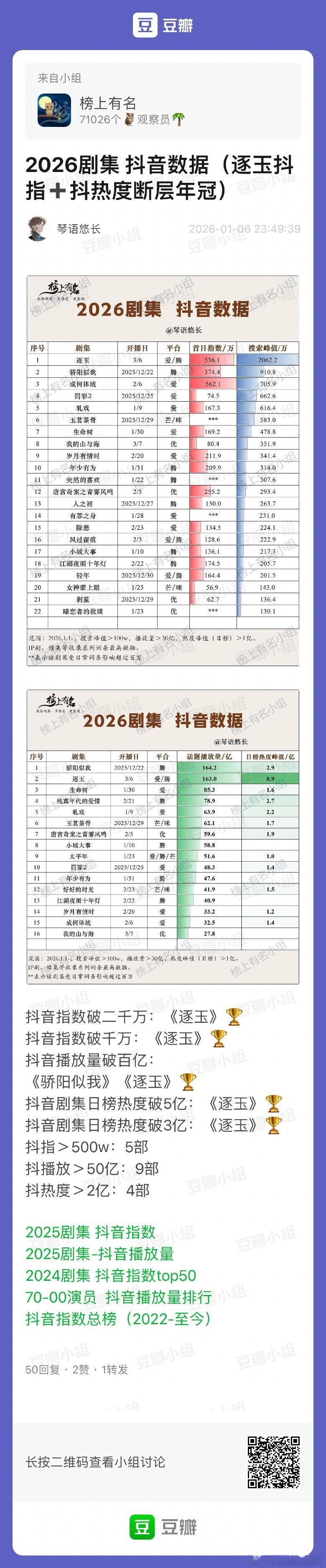 2026剧集抖音指数&话题播放量:抖音指数破2000万:《逐玉》抖音指数破500万:《成何体统》《罚罪2》《轧戏》《玉茗茶骨》