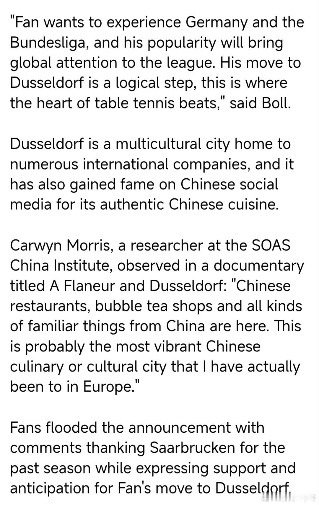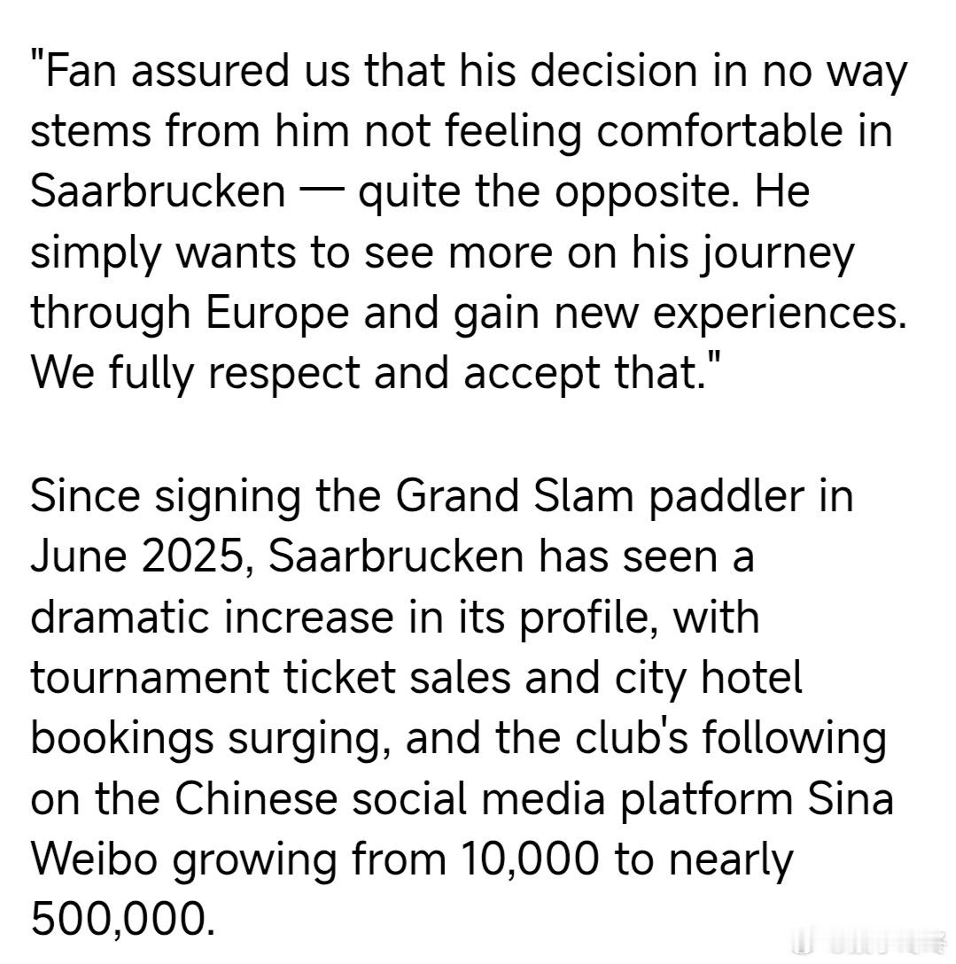 “樊(振东)向我们保证,他的决定绝非因为在萨尔布吕肯感到不自在——恰恰相反。他只是想在欧洲之旅中看到更多风景、收获新体验。我们完全尊重并接受他的决定。”
