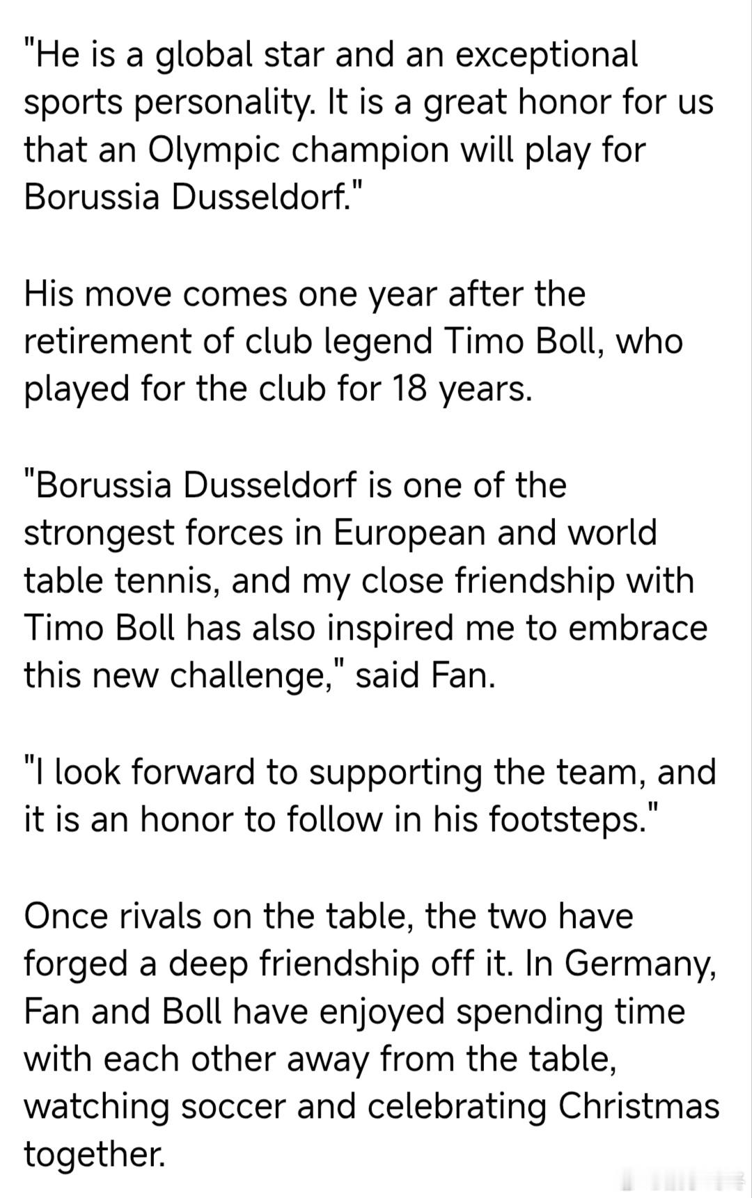 “杜塞尔多夫是欧洲乃至世界乒乓球界的一支劲旅,我和蒂姆·波尔的亲密友谊也激励我迎接这一新挑战,”樊(振东)说道。“我期待着为球队提供支持,能追随他的脚步是我的荣幸。”