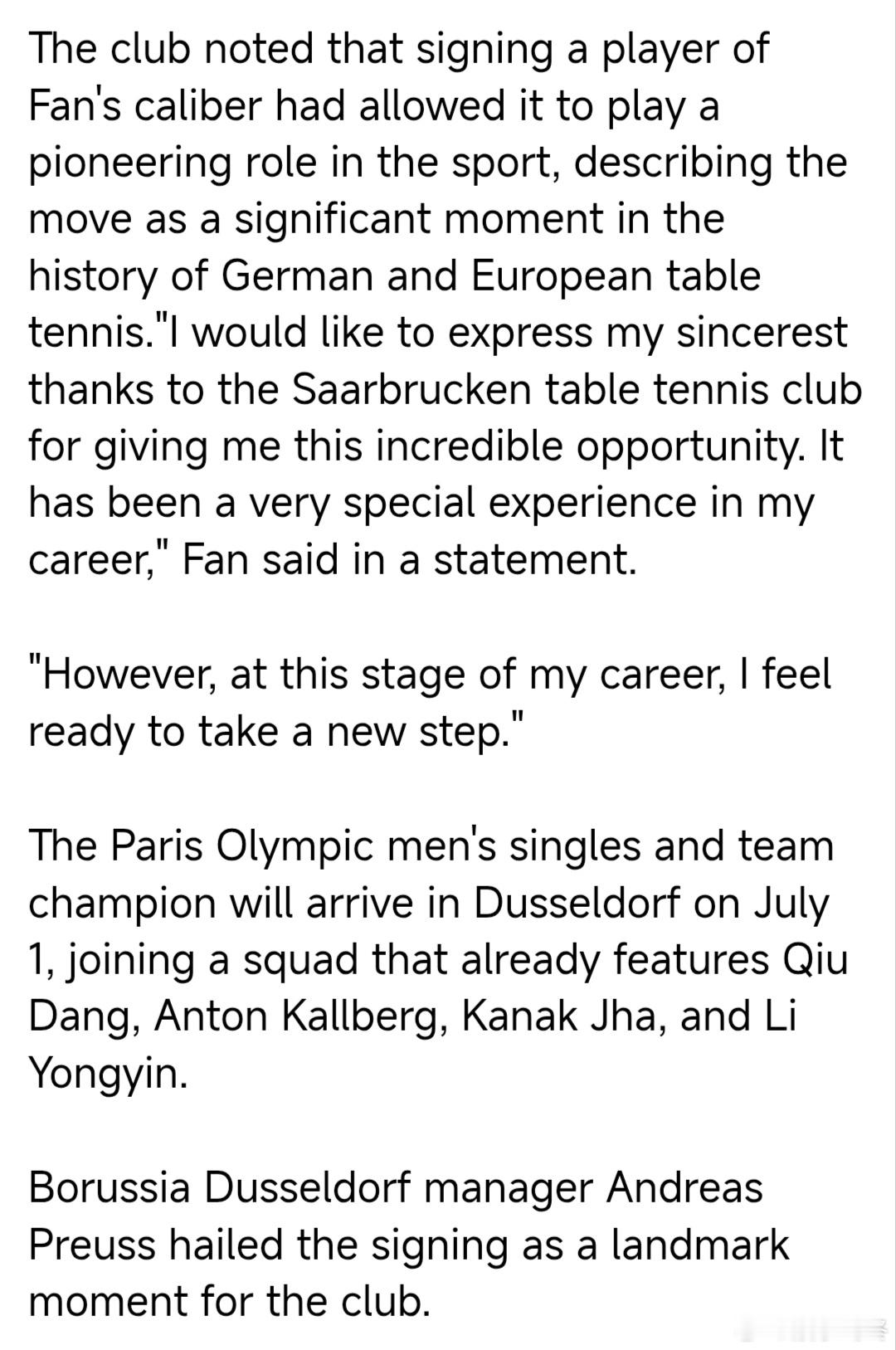 这位巴黎奥运会男子单打和团体冠军将于7月1日抵达杜塞尔多夫,加入一支已经有邱党、安东·卡尔伯格、卡纳克·贾哈和李永胤的队伍。