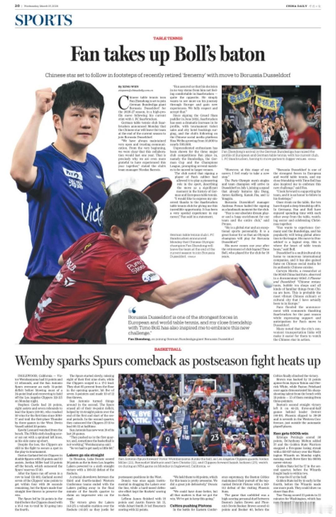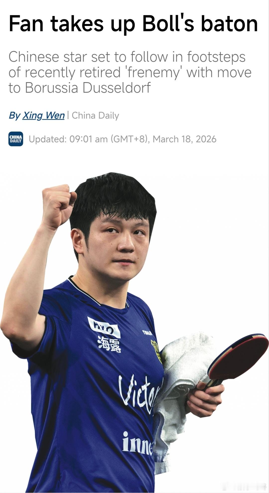 樊振东转会更见人情味樊振东下赛季加盟杜塞尔多夫樊振东樊振东不愧是中德友谊之桥 《China Daily 》今天给的版面。