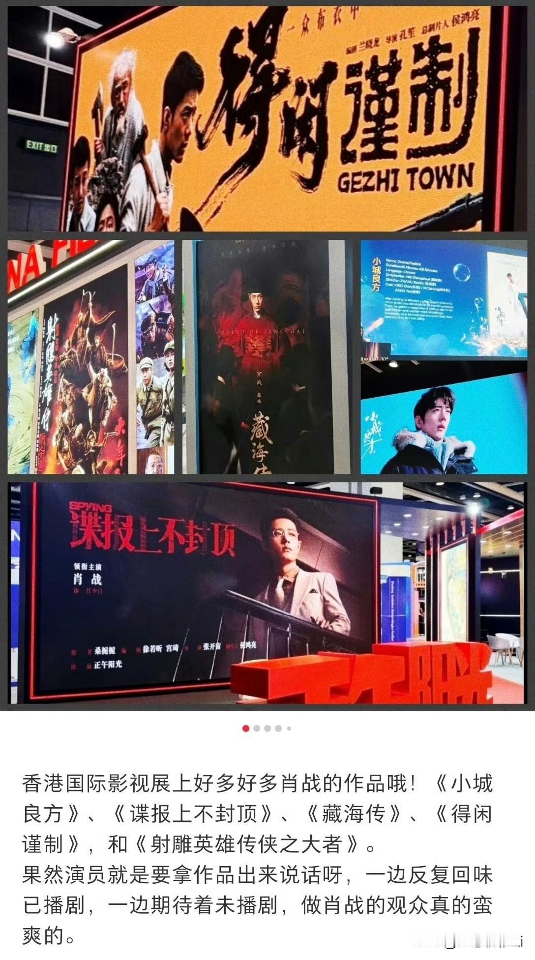 香港国际电影展上,每个制作公司的门面担当都是肖战。 正午的电影《得闲谨制》和待播谍战大剧《谍报上不封顶》在正午的正中央,滚动播放两部作品。 春羽的《藏海传》和中影的《射雕英雄传侠之大者》也在醒目的最中央宣传位。 柠檬的待播大剧《小城良方》也在发布会上闪亮登场。 连未官宣未拍的十日也非常醒目。 这些都是肖战已播和待播的重要作品,都是行业头部龙头大制作,就连未官宣的也是业内最顶级的投资作品。 肖战就是头部影视,头部编剧的精良制作首选男主。有实力有商业价值有世界影响力,又敬业专注肯突破的演员太罕见了,能抢到肖战就是幸运