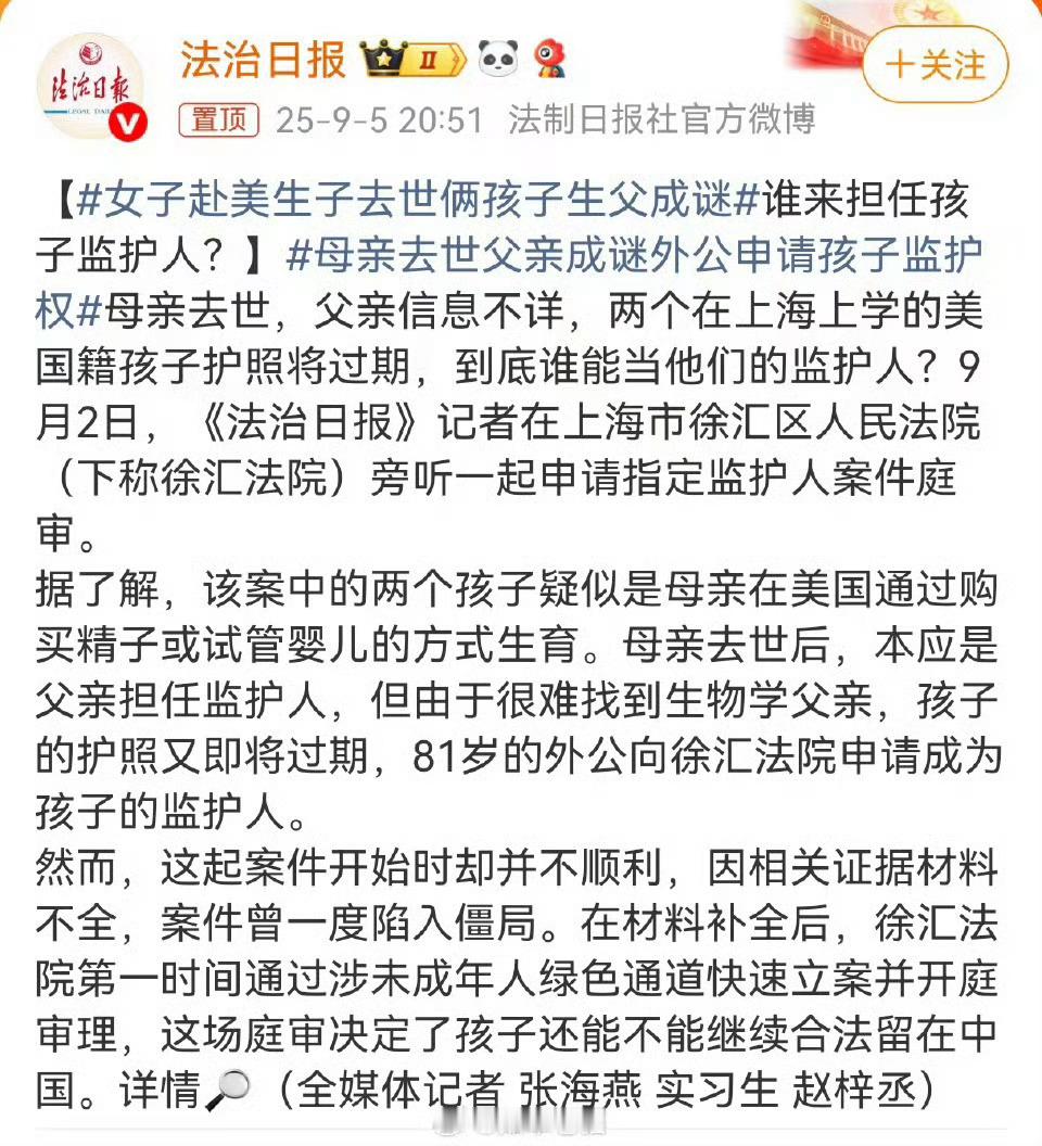 81岁老人为外籍外孙女寻意定监护人这个新闻,去年就上过热搜,女儿跑到美国去生了两个孩子,不知道孩子的亲生父亲是谁,两个孩子美国籍,但是,在上海上学,因为女儿去世了,孩子护照过期了,如果没有监护人就要被驱逐出境了,81岁外公申请成了两个美国外孙女的监护人。