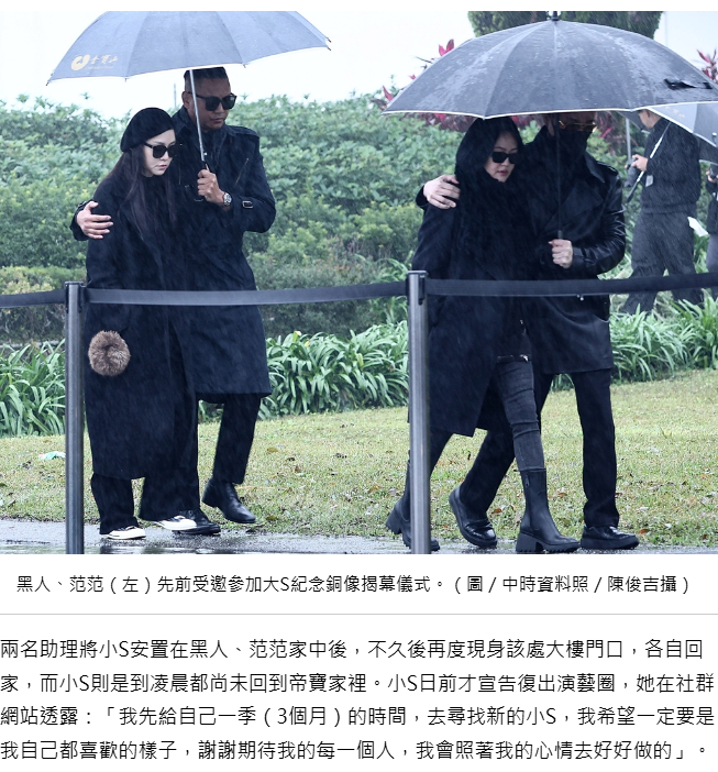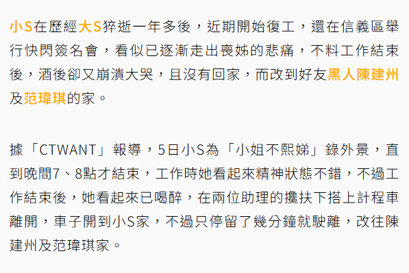 【小S复工崩溃大哭】小S酒后崩溃痛哭直奔范玮琪家据台媒,小S在历经大S去世一年多后,近期开始复工,还举行了快闪签名会,看似已逐渐走出悲痛,不料工作结束后,酒后却又崩溃大哭,且没有回家,而是去了好友黑人陈建州及范玮琪的家。5日小S为《小姐不熙娣》录外景,直到晚上7、8点才结束,工作时她看起来精神状态不错,不过工作结束后,她看起来已喝醉,在两位助理的搀扶下搭车离开,车子开到小S家,不过只停留了几分钟就离开,改往陈建州及范玮琪家。到了陈建州及范玮琪家门口,两位助理扶小S下车,而此时可以见到她的情绪看起来已崩溃,并放声哭了起来,与之前在工作时的状态有很大的差异,而小S就这样哭着进到陈建州及范玮琪家,随后两位助理都各自离开,小S则一直到隔日凌晨都未离开。(联合报、中时新闻)曝小S哭着去陈建州范玮琪家