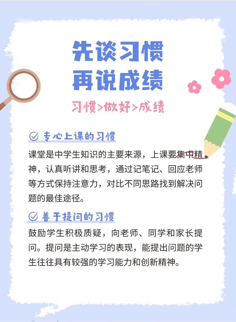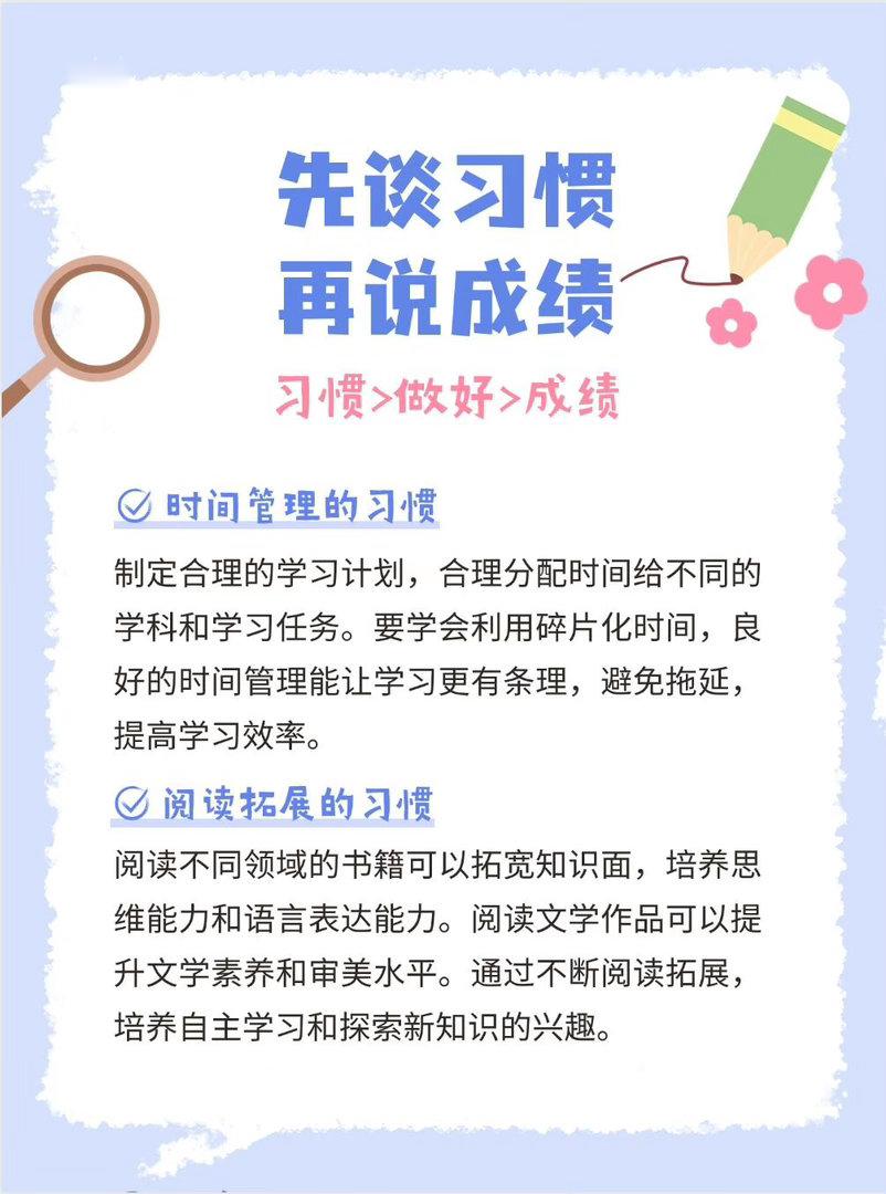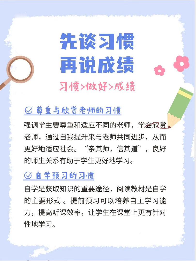 开学焕个新人设先谈习惯、再说成绩学习逆袭秘籍 | 先抓习惯,再谈成绩📈宝子们,学习这件事,习惯真的太重要啦!都说先抓习惯,再谈成绩,这话简直是真理✨尊重欣赏老师,学习事半功倍“亲其师,信其道”,老师们教学风格各异,我们要学会尊重和欣赏。当你打心底认可老师,就会更愿意听Ta的课,吸收知识也更高效。我之前有个同学,本来偏科严重不喜欢某科老师,后来尝试去发现老师的优点,主动适应老师的教学节奏,成绩居然慢慢就提上来了。这种适应能力,以后步入社会也超有用的~自学预习,做学习的主人自学是获取知识的超重要途径!通过阅读教材提前预习,能让我们在课堂上更有主动权。我自己预习的时候,会把新知识的要点划出来,遇到不懂的就标记好,等上课着重听。这样不仅能培养自主学习能力,还能大大提高听课效率,感觉自己就像学习的小主人🎓专心上课,开启知识盛宴课堂可是知识的大宝藏!上课必须得集中精神,认真听老师讲,还要留意同学的发言。要是不小心走神了,就赶紧记笔记或者思考老师的问题来拉回注意力。把老师、同学和自己的思路对比对比,能发现好多解题的巧妙方法,每节课都像一场知识盛宴🍱善于提问,解锁智慧宝箱别害怕问问题呀!学问学问,就是要边学边问。有疑惑就大胆地问老师、问同学,把不懂的都弄明白。能提出问题说明你在深度思考,这可是超强学习能力和创新精神的体现。我每次问完问题,都感觉自己又解锁了一个知识宝箱🎁宝子们,从现在开始培养这些好习惯,相信我们都能在学习上一路开挂,成绩蹭蹭往上涨💯开学季