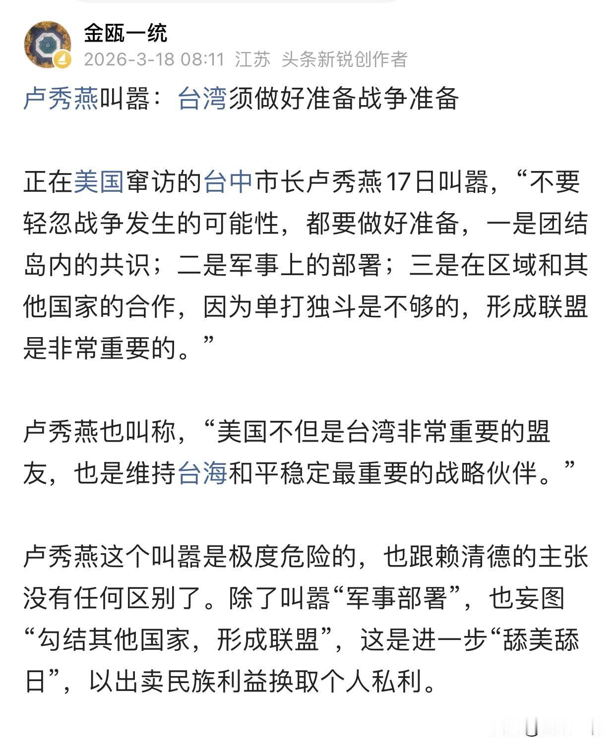 卢秀燕叫嚣:台湾须做好战争准备 针对台中市长卢秀燕在美国发表“战争论”,我早上发了一篇批判的文章,结果2个多小时后,文章被删除,给出的理由是“不适合”。 但是很讽刺的是,多个账号抄袭我文章的内容,却被允许存在。 为揭露岛内政客的真实嘴脸,再次将早上的文章截取部分发表。 台中市长卢秀燕17日在美国叫嚣,“不要轻忽战争发生的可能性,都要做好准备;并要做好三点,一是团结岛内的共识,二是军事上的部署,三是和其他国家的合作,形成联盟,因为单打独斗是不够的。” 卢秀燕只是岛内政客的一个代表,有的表露得露骨些,有的掩藏得深一些。 卢秀燕这次跳出来,主要是向美国递“投名状”,和赖清德争做“美国的马前卒”。