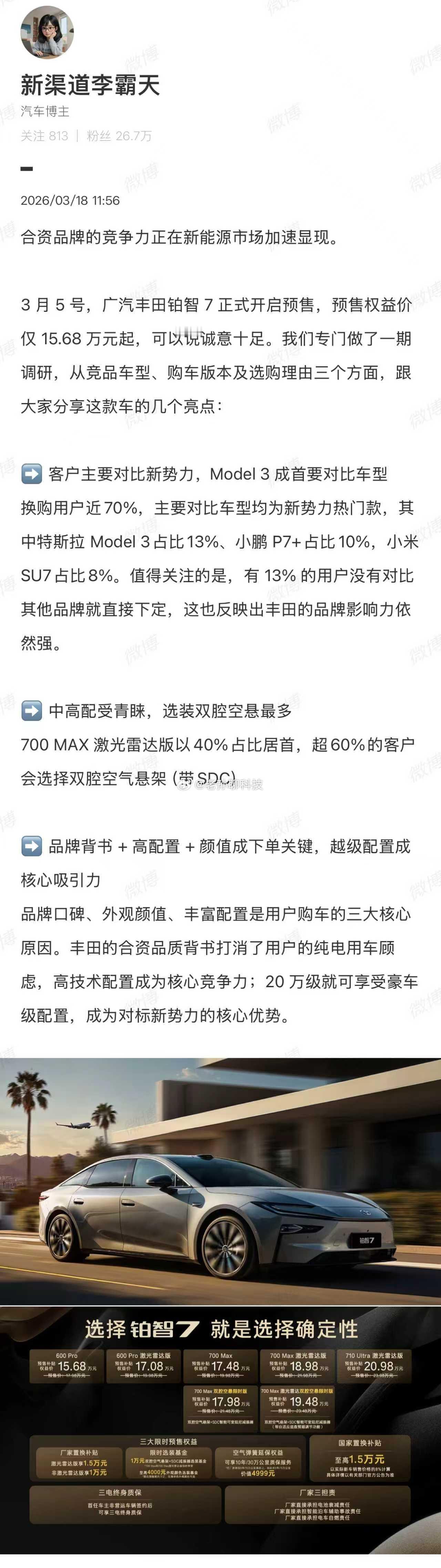 买特斯拉和丰田电车竟是同一批人有博主在谈铂智7的预售用户画像,这车谁家的?丰田的。说实话,确实愣了一下