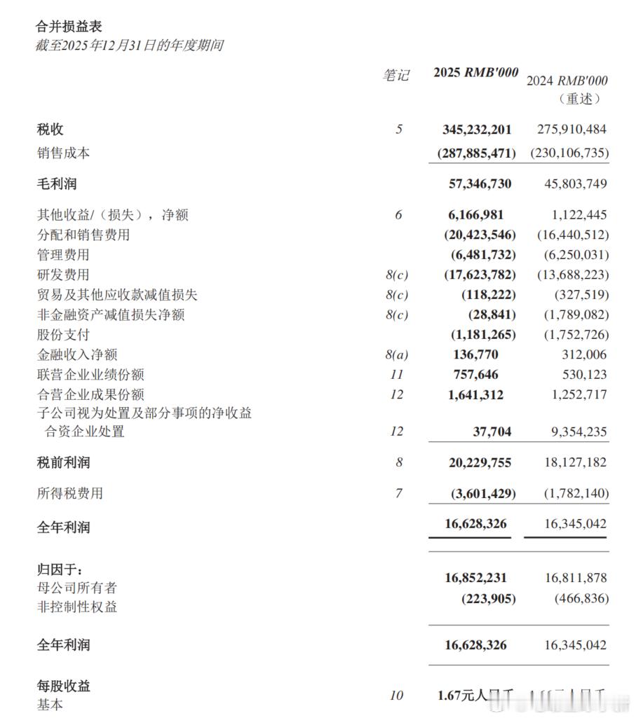⭐财报数据- 总收入 3452 亿元,同比 +25%- 公司核心归母净利润为 144.1 亿元,同比 +36%- 毛利总额 573 亿元,同比 +25%- 现金储备 682 亿元,同比 +46%- 研发投入 218.7 亿元,同比 +8.3%