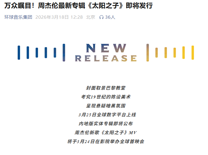 【周杰伦太阳之子MV6分58秒】太阳之子是张学友给周杰伦的昵称环球音乐官宣周杰伦新专辑《太阳之子》即将发行周杰伦新歌预告。 封面取景巴黎教堂,首波同名主打《太阳之子》MV长达6分58秒。