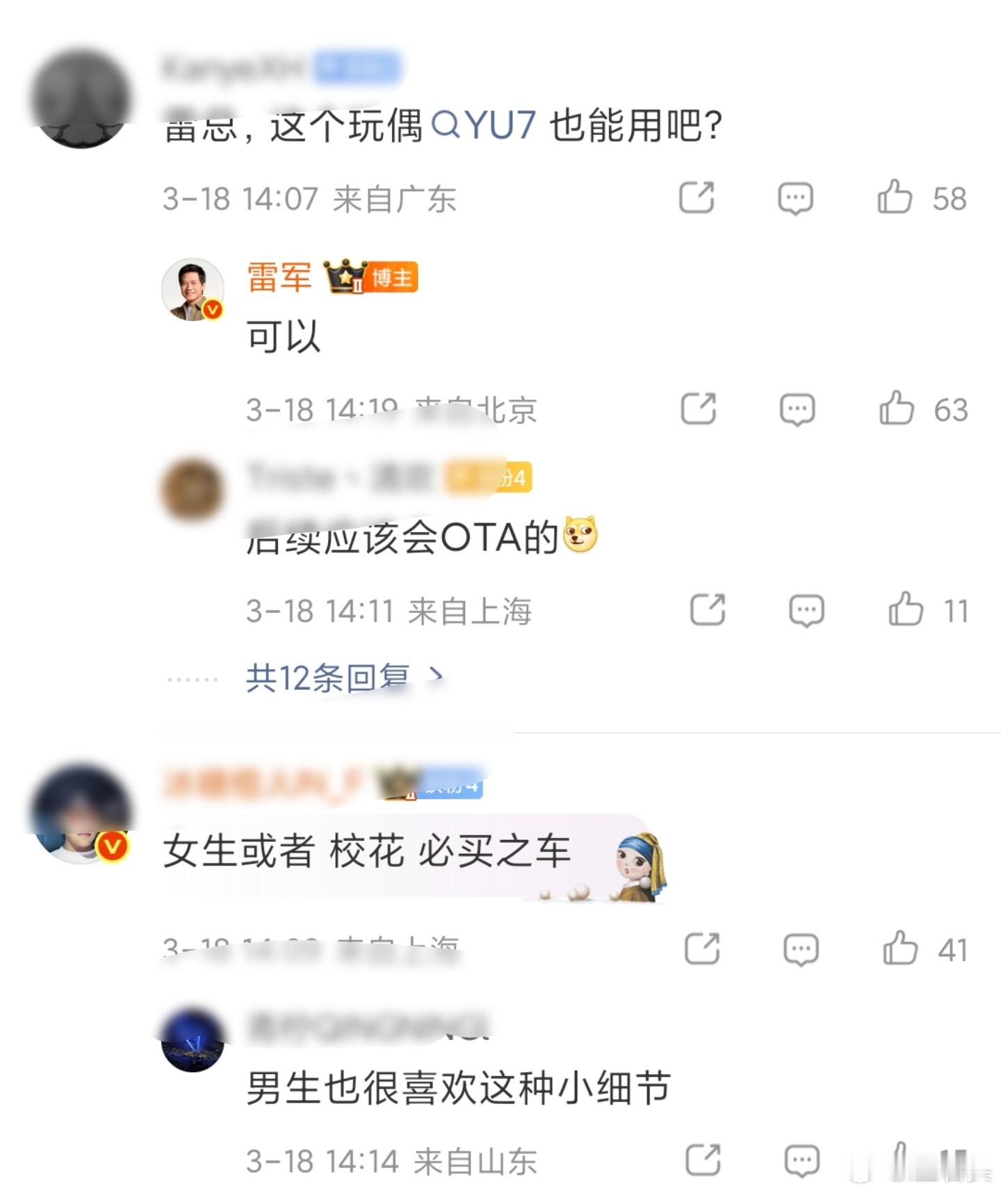 看了下雷总评论区,不出意外,这个功能肯定是要圈粉很多人了,而且YU7车主也在评论区求升级。
