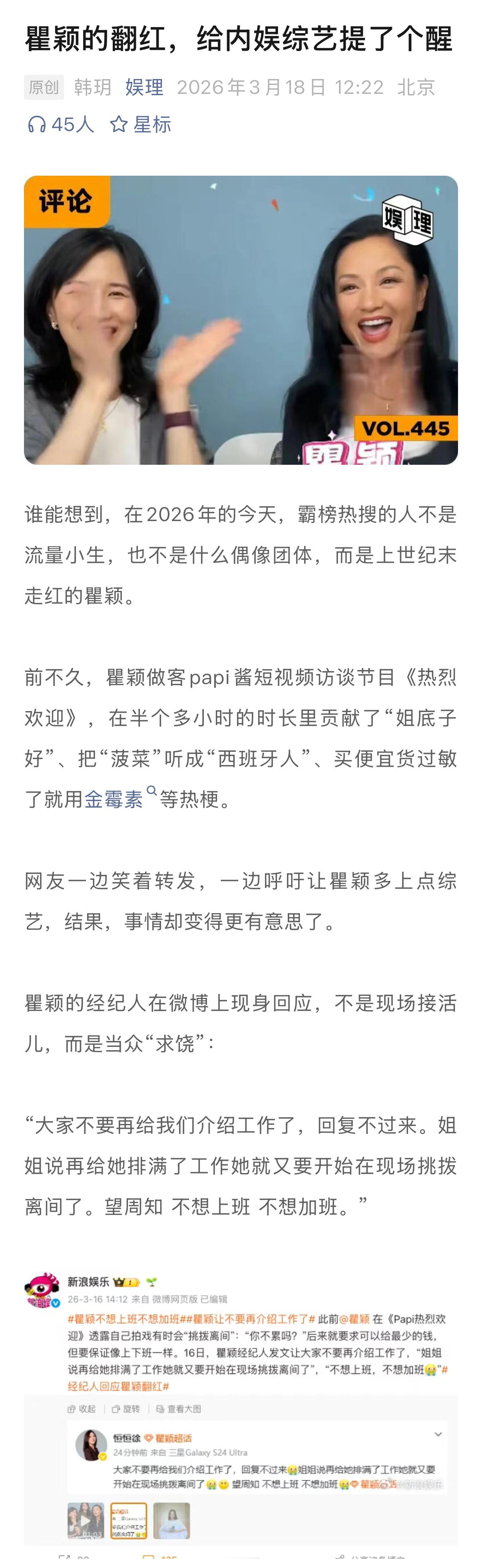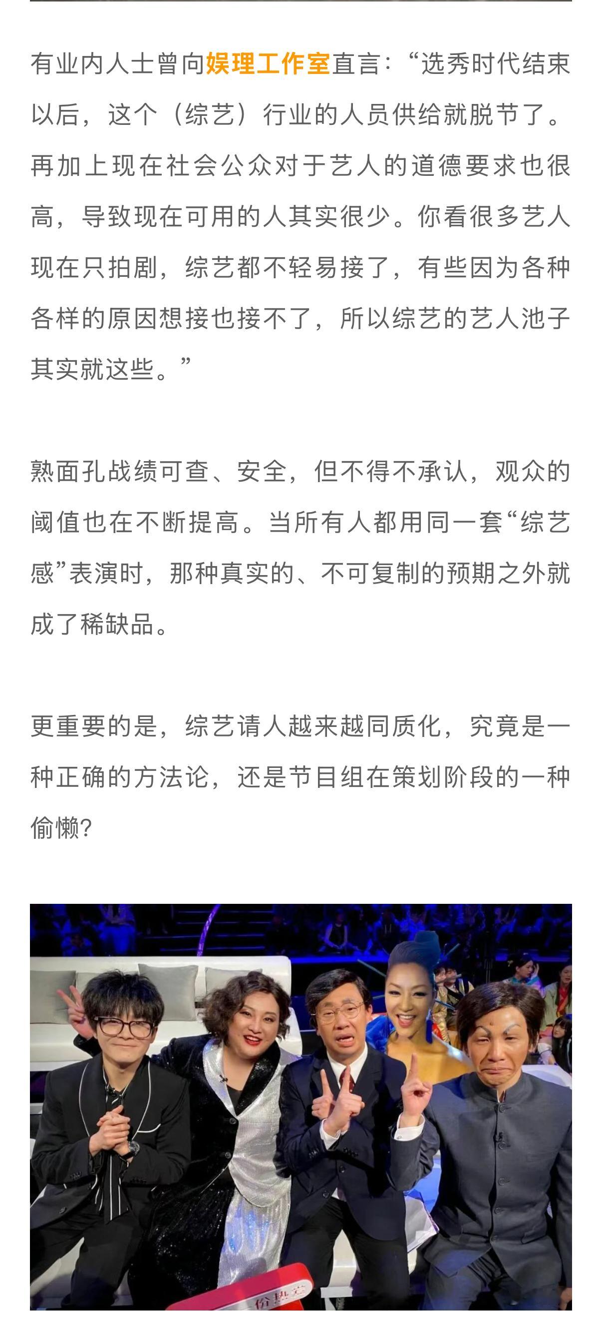与此同时,在网友呼吁瞿颖多上综艺的同时,也点出了一个很现实的问题:我们现在的综艺嘉宾,面孔是不是太固定了?综艺请人越来越同质化,究竟是一种正确的方法论,还是节目组在策划阶段的一种偷懒?更多内容,请戳娱理独家↓