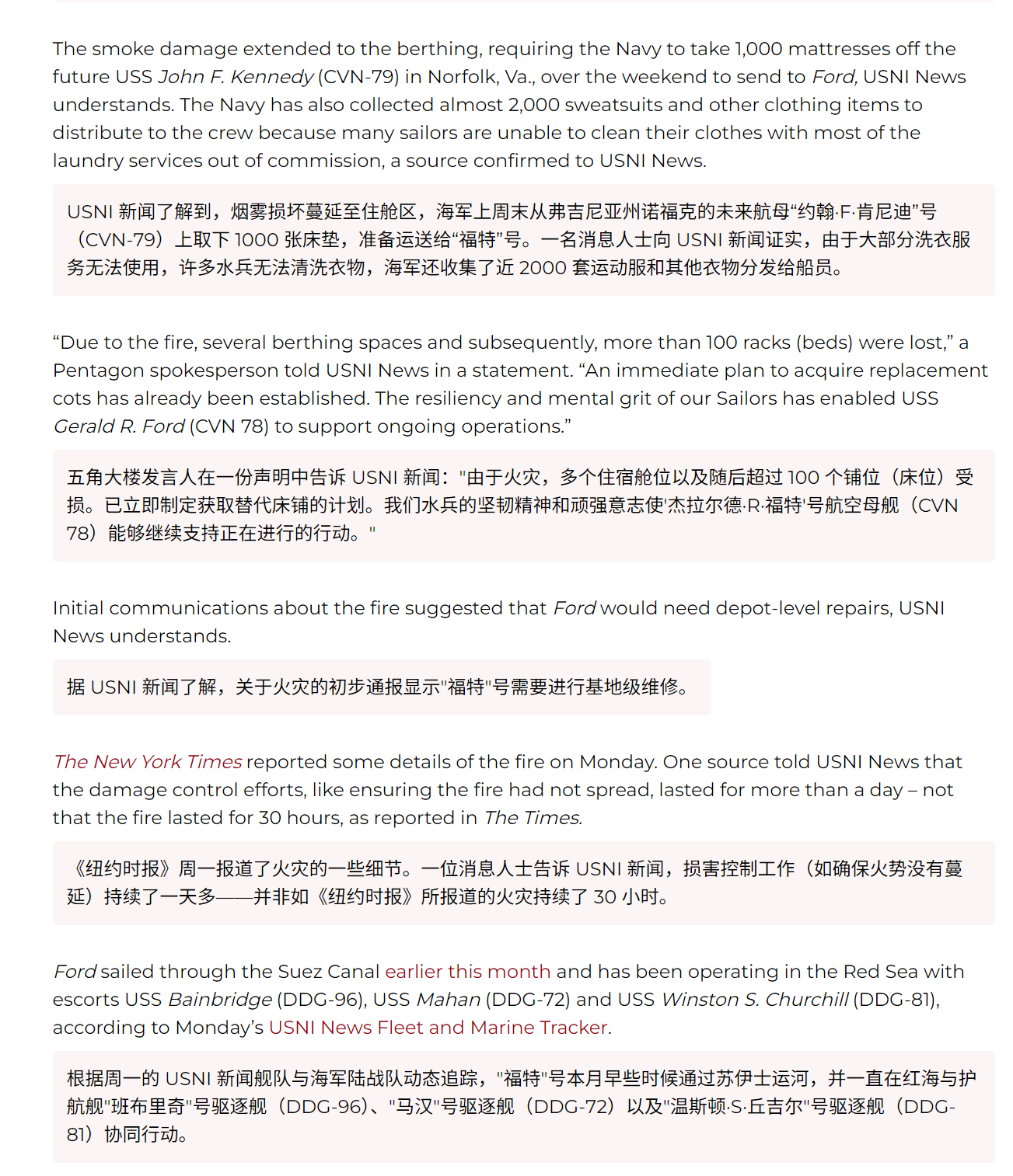 🔻《纽约时报》周一报道了福特号火灾的一些细节,比如火灾持续了 30 小时。🔻美国一位消息人士告诉 USNI 新闻,《纽约时报》是 fake news,“并非火灾持续了 30 小时,而是损害控制工作(如确保火势没有蔓延)持续了一天多”——我无法理解。🔻我不明白。伊朗革命卫队报复行动升级以色列因总理身亡传言连发3天视频海外新鲜事中东现场直击