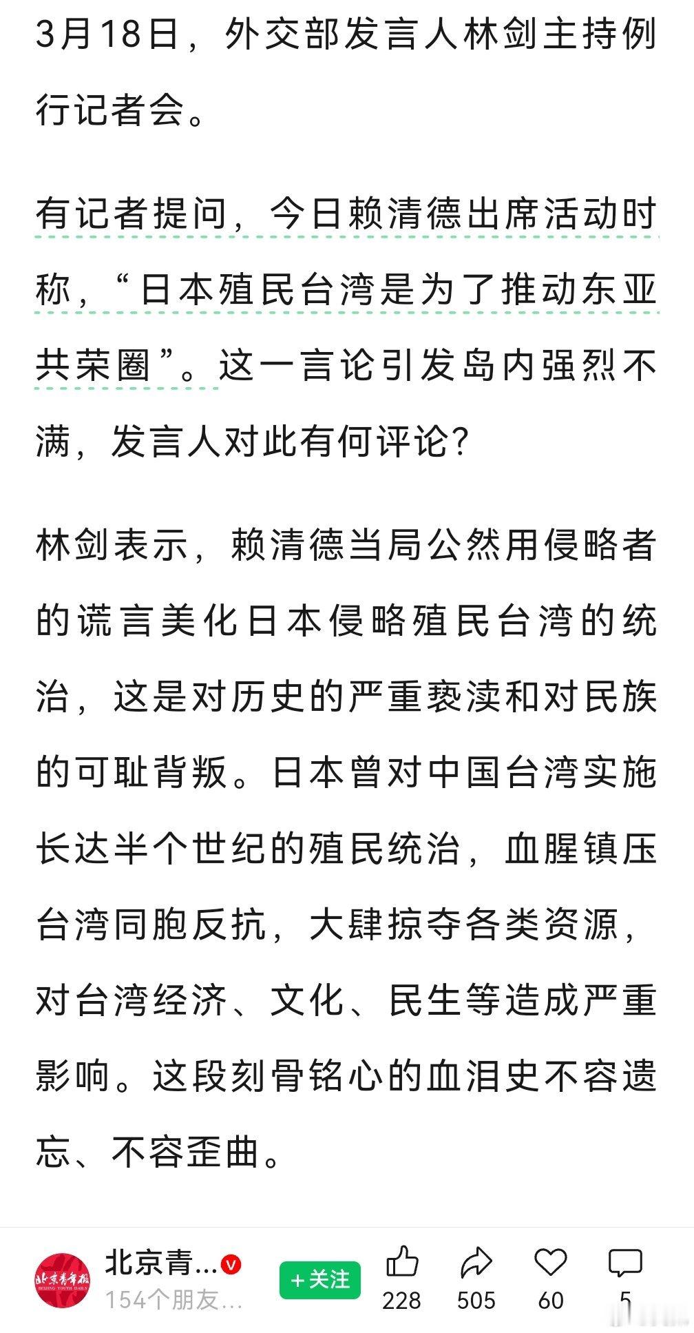 赖清德出席活动时称,“日本殖民台湾是为了推动东亚共荣圈”。