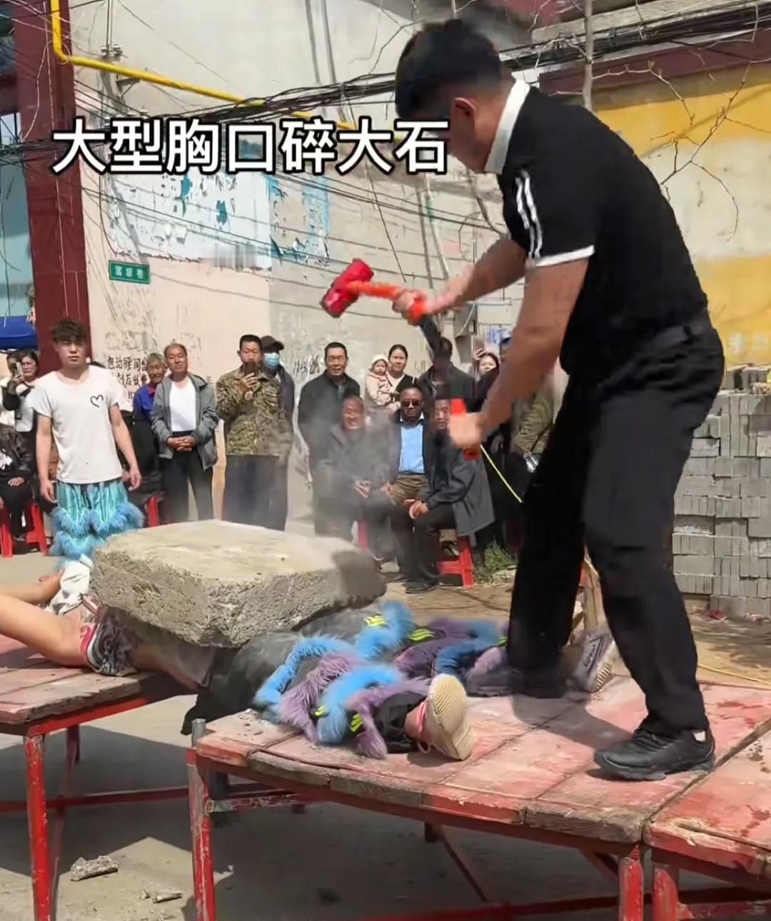 胸口碎大石算不算"骗局"?或者说根本就是魔术?因为根本不难啊!成年男人都能来啊,石头越厚越大越安全,卖艺的鼓吹多难多疼不都是表演吗?首先表演碎大石的锤子把全是橡胶的或者塑料管的,真有本事换成木头的,不就是为了泄力嘛,锤子把甩起来就把力量卸掉了,只有锤子落到石头上,石头很厚,锤子的力量根本传不到底下那个人肚子上。