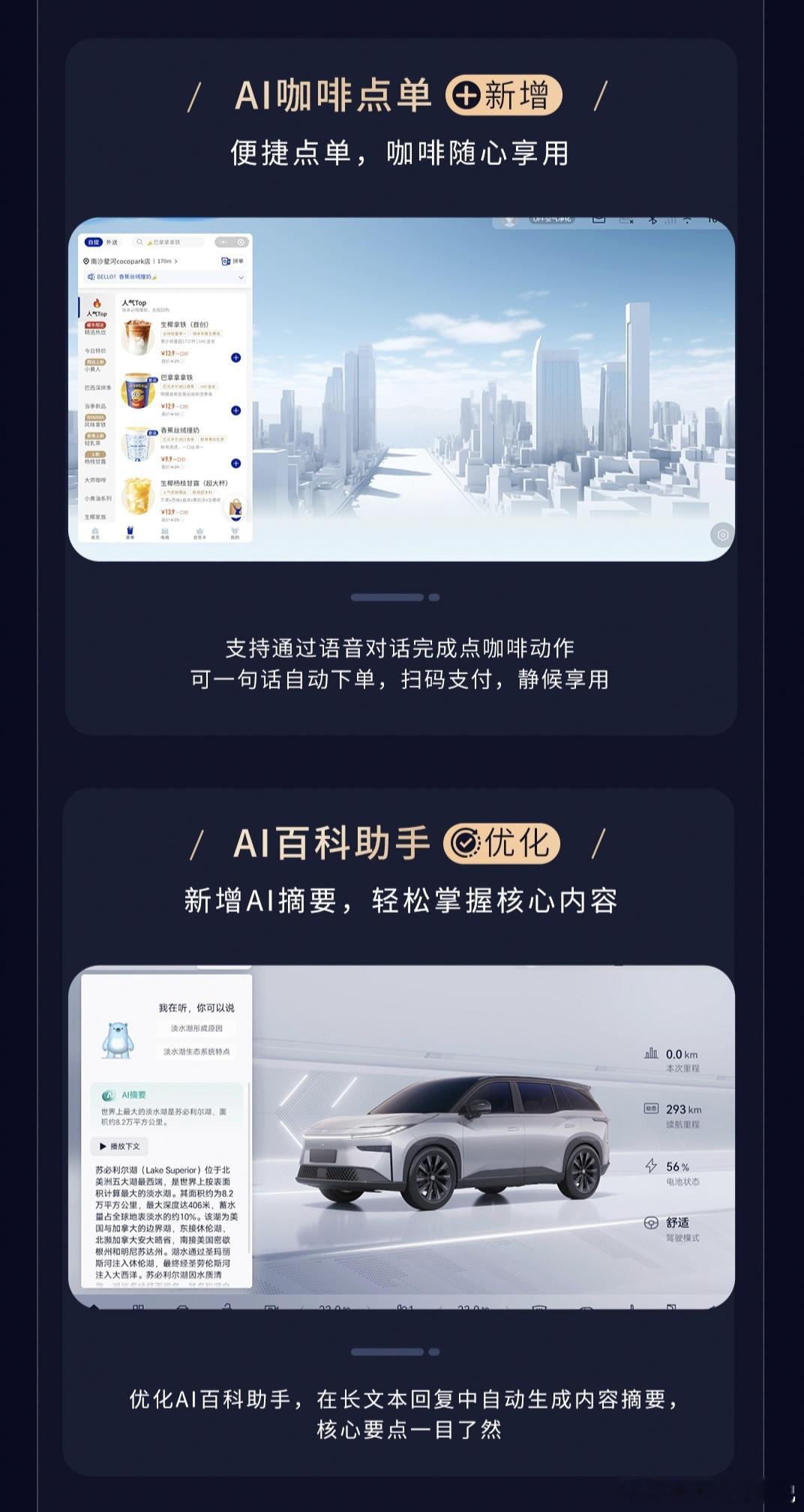 整次的OTA主要集中在智能化这块:先说智能座舱,这次直接落地了全栈大模型能力,通过六大AI智能体,把车辆从单纯的指令执行终端,变成了可协同决策的出行助手,一句话就能完成全程旅行规划、一键生成专属电台、甚至在车内直接点咖啡,这些功能单独看确实不新鲜,但关键是,这次是把它们全部整合进了统一的交互体系里,彻底告别了过去功能割裂的使用感,再搭配AI摘要、场景大师等细节优化,说人话就是,现在的智能座舱更懂你了。