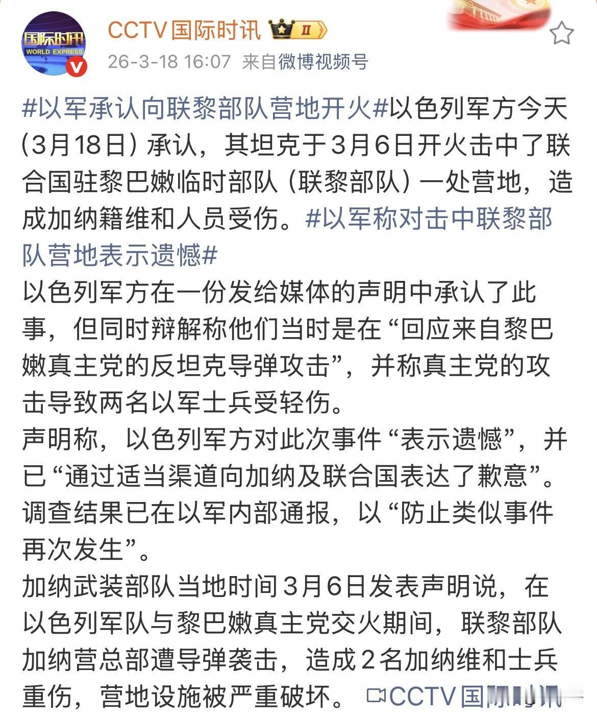 以军坦克向联黎部队开火! 以色列国防军在声明中承认以军坦克击中了联黎部队一处营地,导致2名加纳维和士兵重伤。 不过,以色列对此解释称以军并非是故意袭击联黎部队建筑,而是由于遭受到真主党武装袭击所作出的回击。 据悉,以色列为彻底打击真主党武装已动员了超过10万人的部队在黎巴嫩境内开展军事行动。