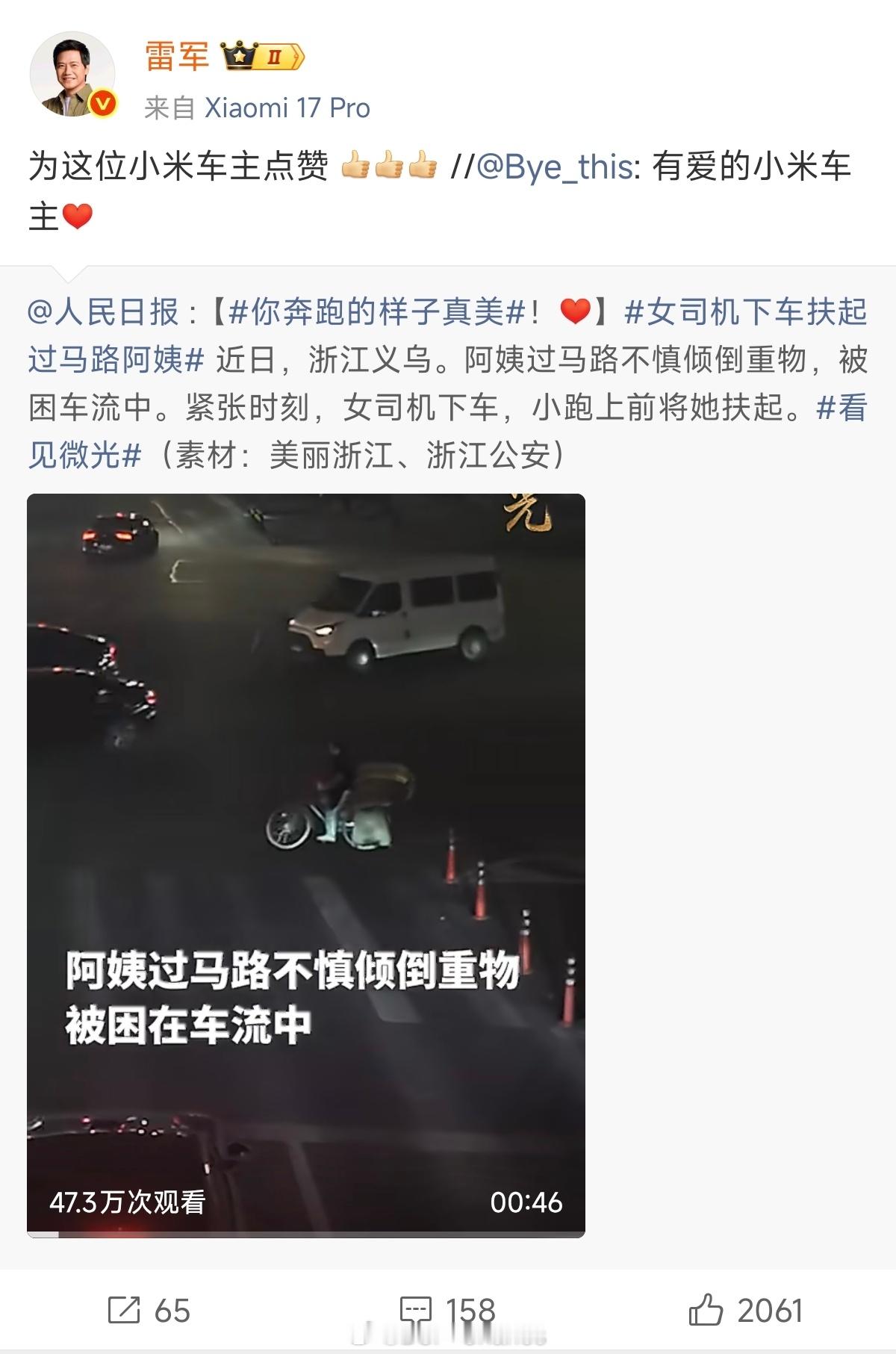 雷军点赞小米车主助人善举为这位小米车主点赞,年轻有温度、善良且高素质的群像是大家一起构建的。