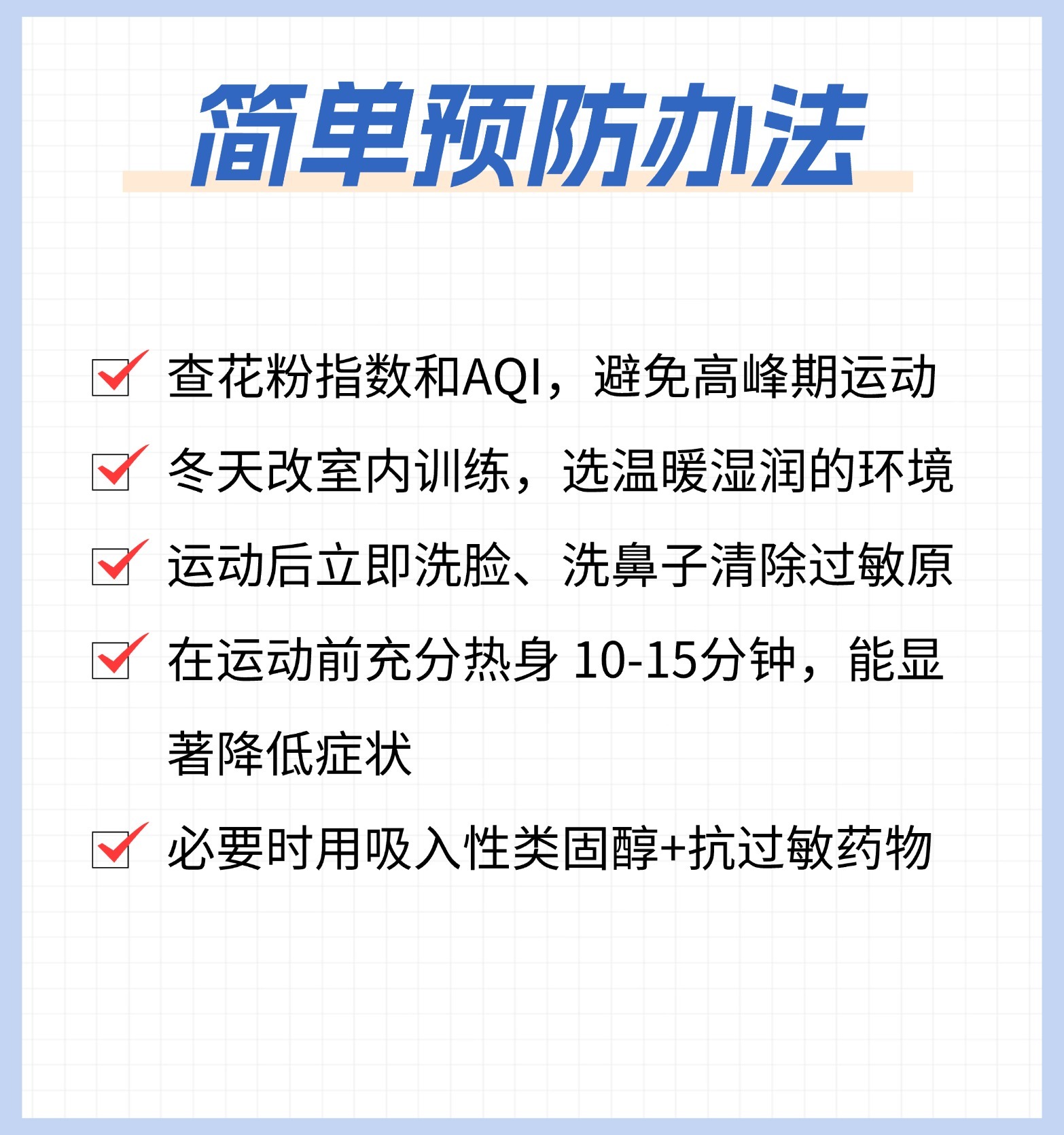 ✅简单预防办法01. 查花粉指数和AQI,避免高峰期运动02. 冬天改室内训练,选温暖湿润的环境03. 运动后立即洗脸、洗鼻子清除过敏原04. 充分热身(10-15分钟)能显著降低症状05. 必要时用吸入性类固醇+抗过敏药物