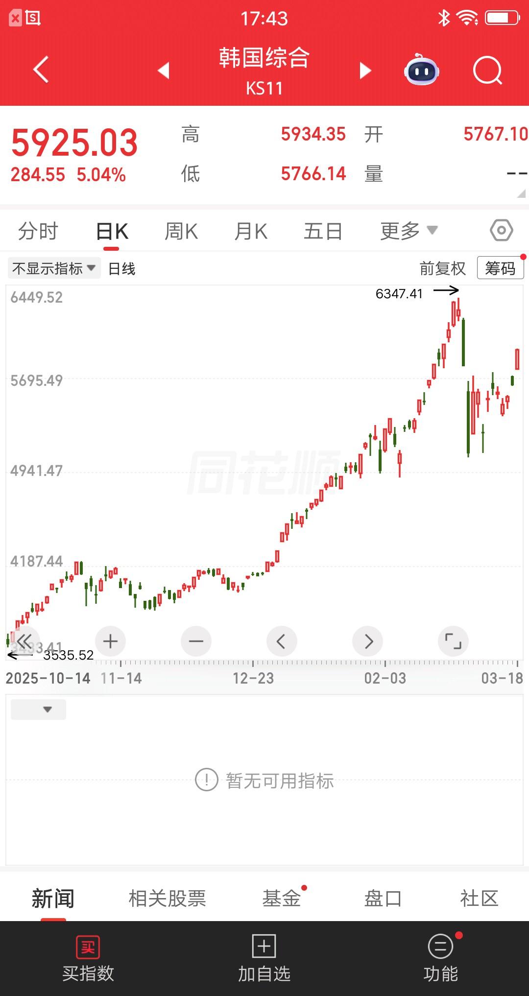 亚太股市今天表现最强的是韩国,开盘后垂直上涨2.3%,此后持续稳步走高。收盘大涨五个点,从开盘到收盘,完全没有多余的动作。再看日线图,就是奔着修复前面的大坑去的。 再来一根大阳线,就完全修复了。 早在股市暴跌的时候,韩国就宣布,计划启动100万亿韩元救市。这就是底气,韩国散户可以放心的把钱放进股市,不用提心吊胆,真让人羡慕嫉妒恨呀。