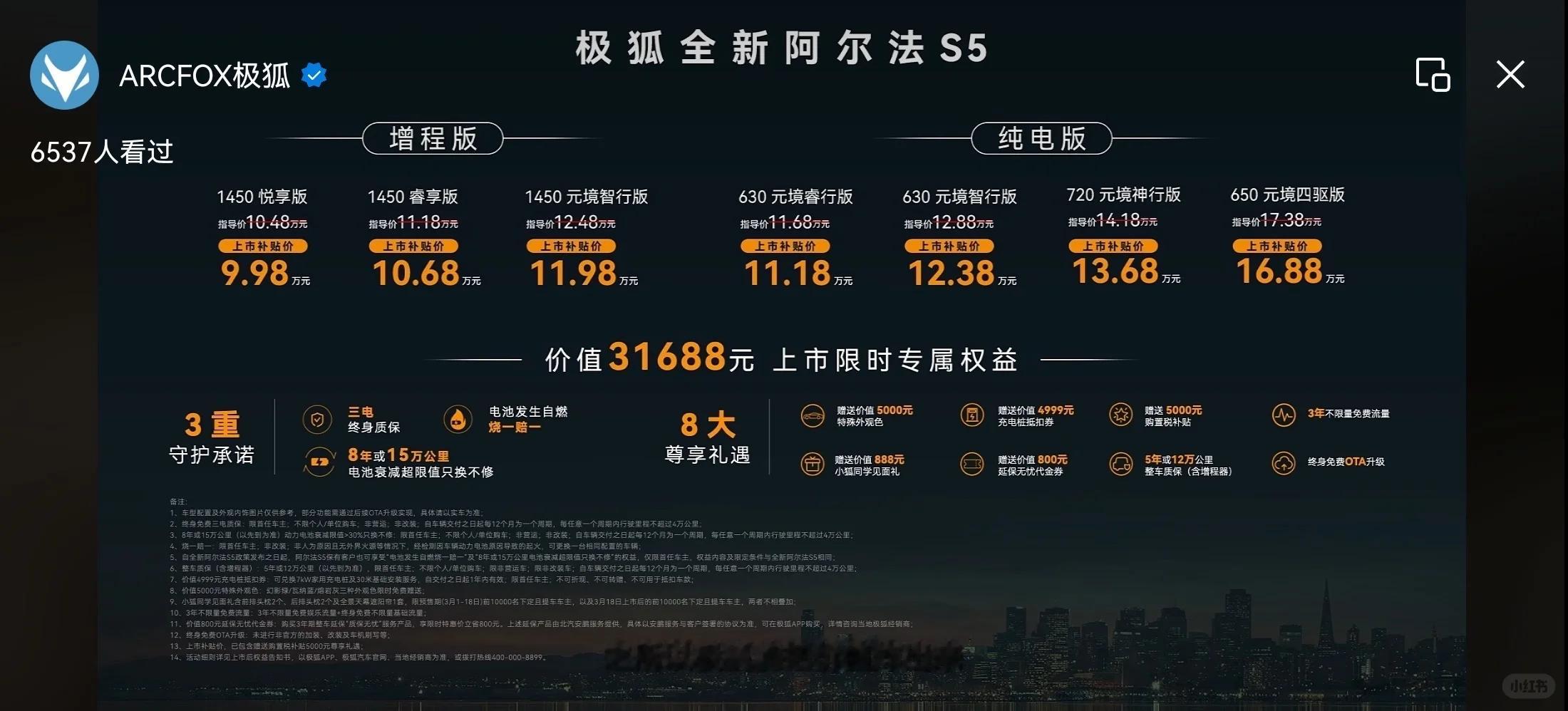 新款阿尔法S5上市!增程+纯电,9.98万元起