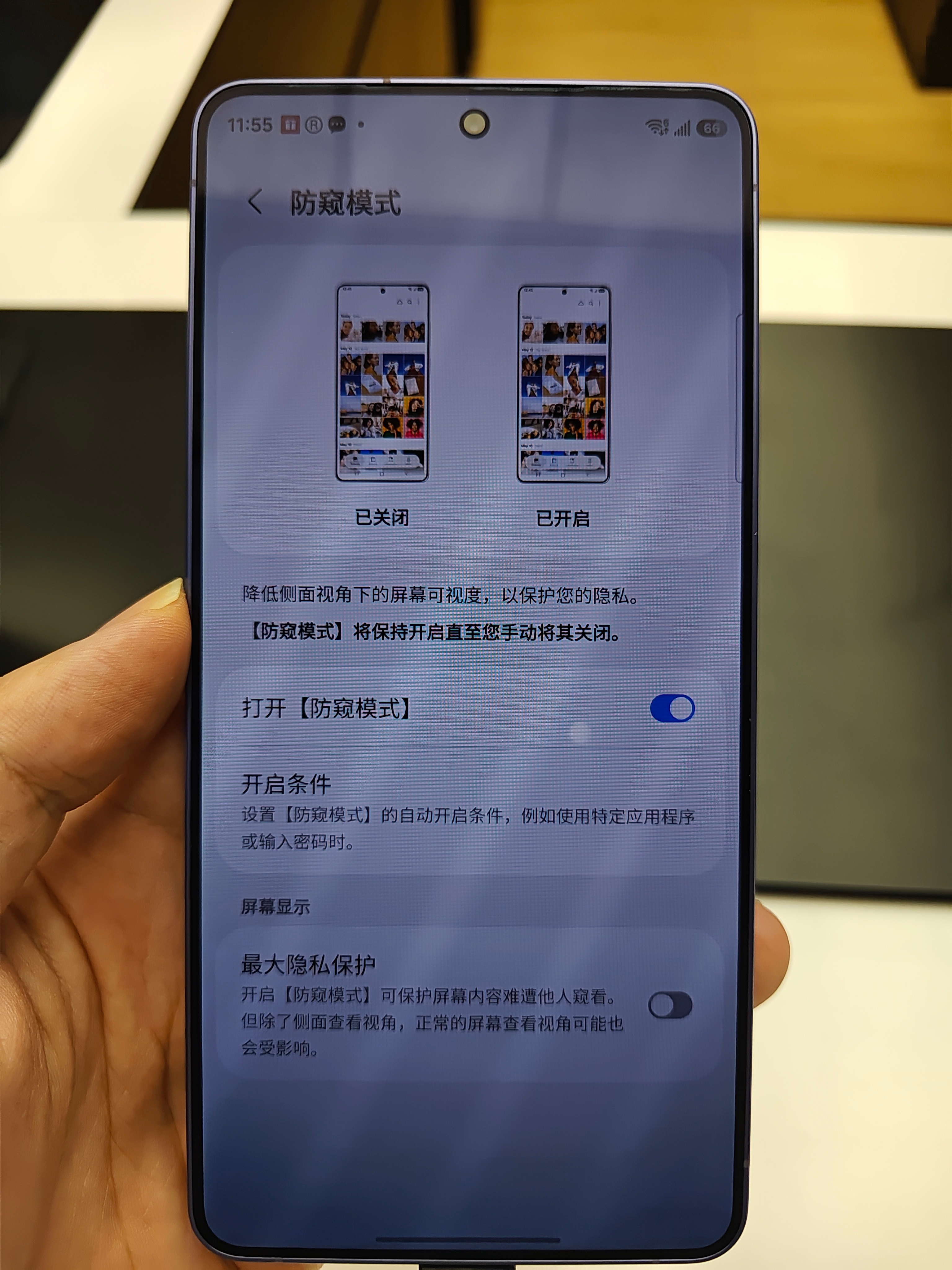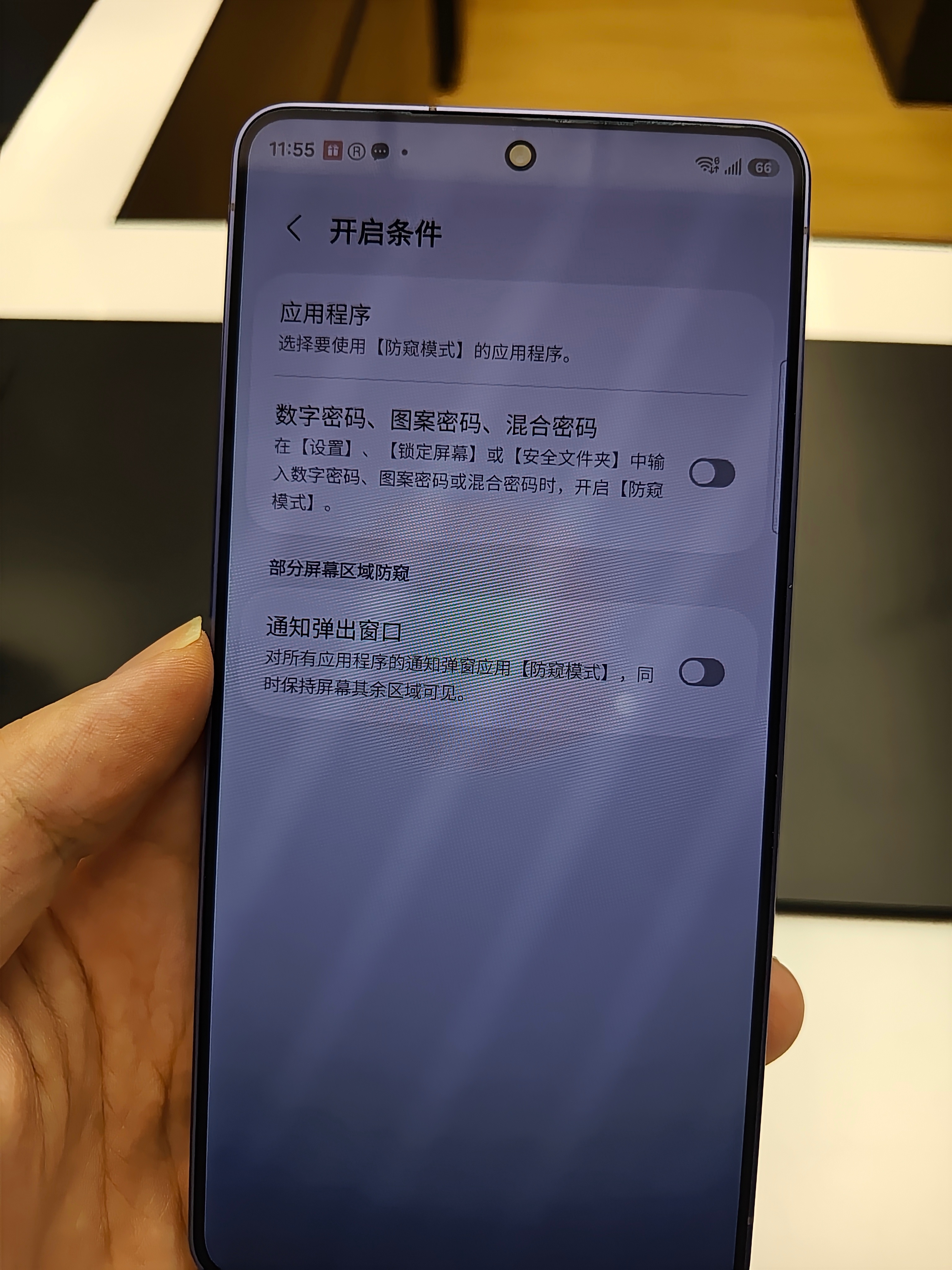 三星新出的 S26 Ultra 防窥屏,其实跟防窥膜的效果差不多,相当于就是一个可以随时取下来防窥膜。