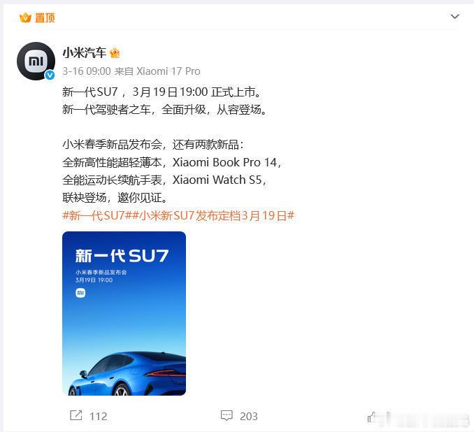 多家车企祝新一代SU7上市成功 新一代SU7将于3月19日正式上市。刚刚,有多家车企包括:等车企预祝新一代SU7上市成功,随后官微也进行了回应。 新车情报局