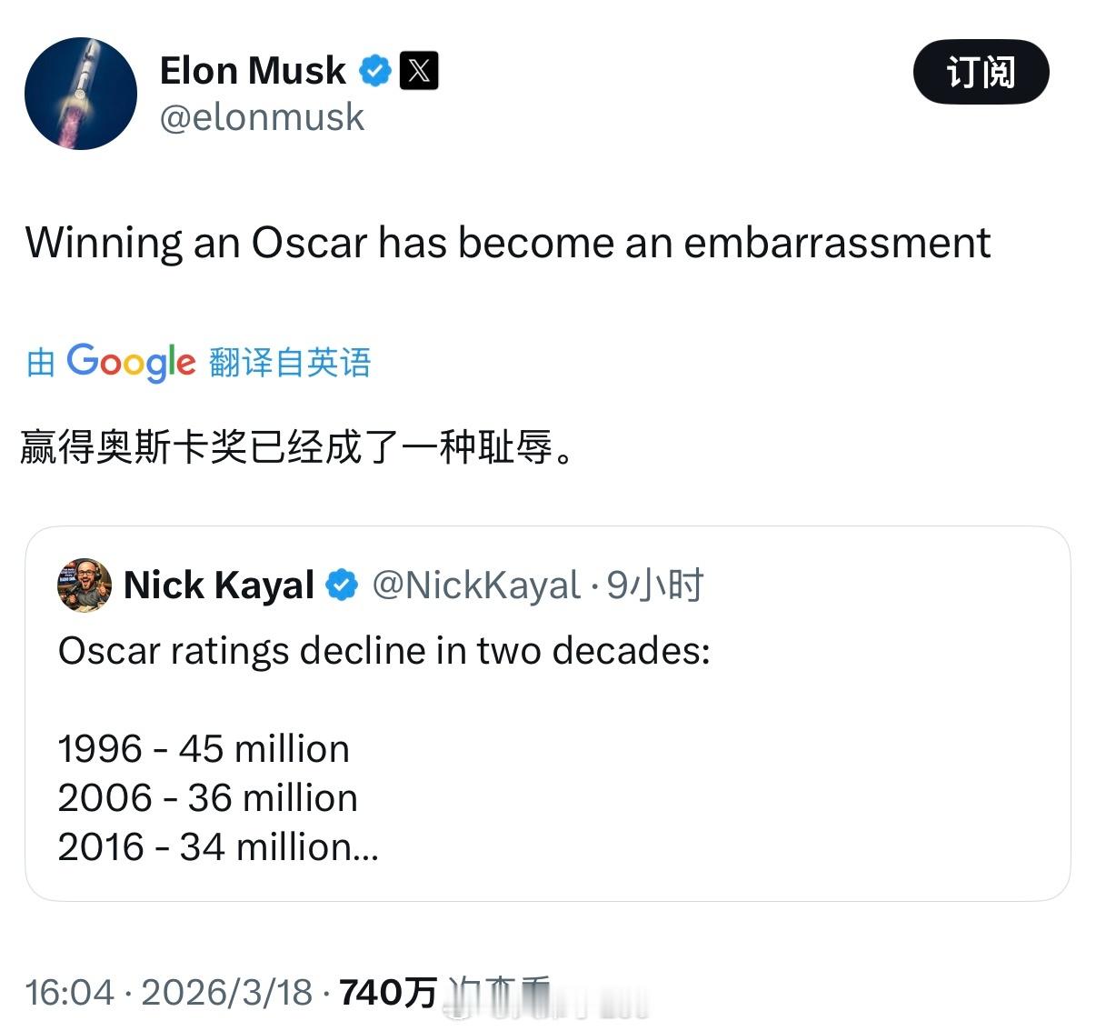 马斯克怒喷奥斯卡“赢得奥斯卡奖已经成了一种耻辱”热点现场