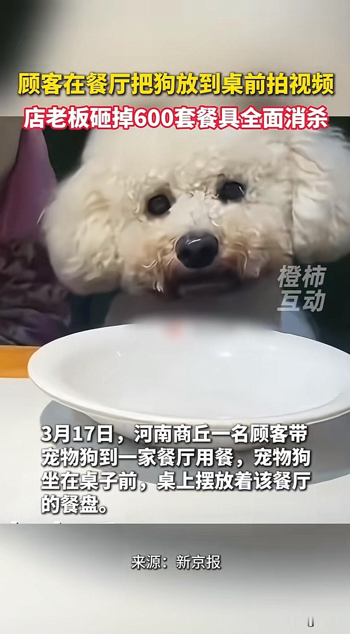 河南商丘,一顾客带狗就餐,把狗放到桌前拍视频,商家将所有餐具砸掉,网友认为商家做法过激,早不让进店不就没事了吗? 顾客进餐厅就餐,期间为了拍视频,把狗狗抱上桌前,视频发布网络引发网友关注。 商家关注到了顾客是在自己店消费拍摄的,当机立断,把600套餐具全部砸掉,换成一次性餐具。 商家这做法有人称赞,认为商家太聪明了,果断砸掉,为顾客安全负责,这是及时止损,虽然损失了餐具,但挽回了顾客的信任。 但有网友不买账,认为商家就不该放狗进店,被曝光才来砸碗,做法太极端,是作秀行为,事后的补救不过是亡羊补牢。 宠物和人类共处需要界线,狗狗身上携带细菌和狂犬病毒有传染给人类的风险,就餐不和狗狗同台,不共用餐具是最基本的底线。 商家看似极端的砸餐具,实则是对顾客健康和安全的重视。 对此事,你怎么看?欢迎评论区留言。 顾客带狗就餐 店主砸碎600套餐具