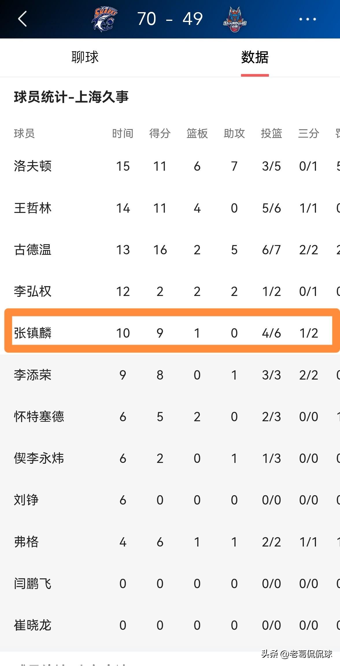 上海久事球星张镇麟真是让人眼前一亮!在今天上海久事主场迎战山东高速的焦点战中,目前两队的上半场比赛已经结束,上海久事以70:49领先对手21分。让人感到非常惊喜的是,在前两节比赛中,张镇麟在进攻端打出了让人眼前一亮的表现,他这颗铁树终于开花了。 在上半场比赛中,张镇麟首发出战10分钟,投篮6中4,其中三分球2中1非常高效的砍下9分,还有1抢断,没有出现任何的失误,他的场上正负值为+13。